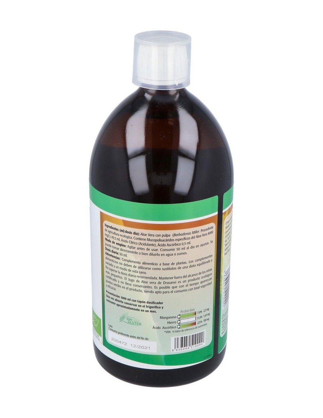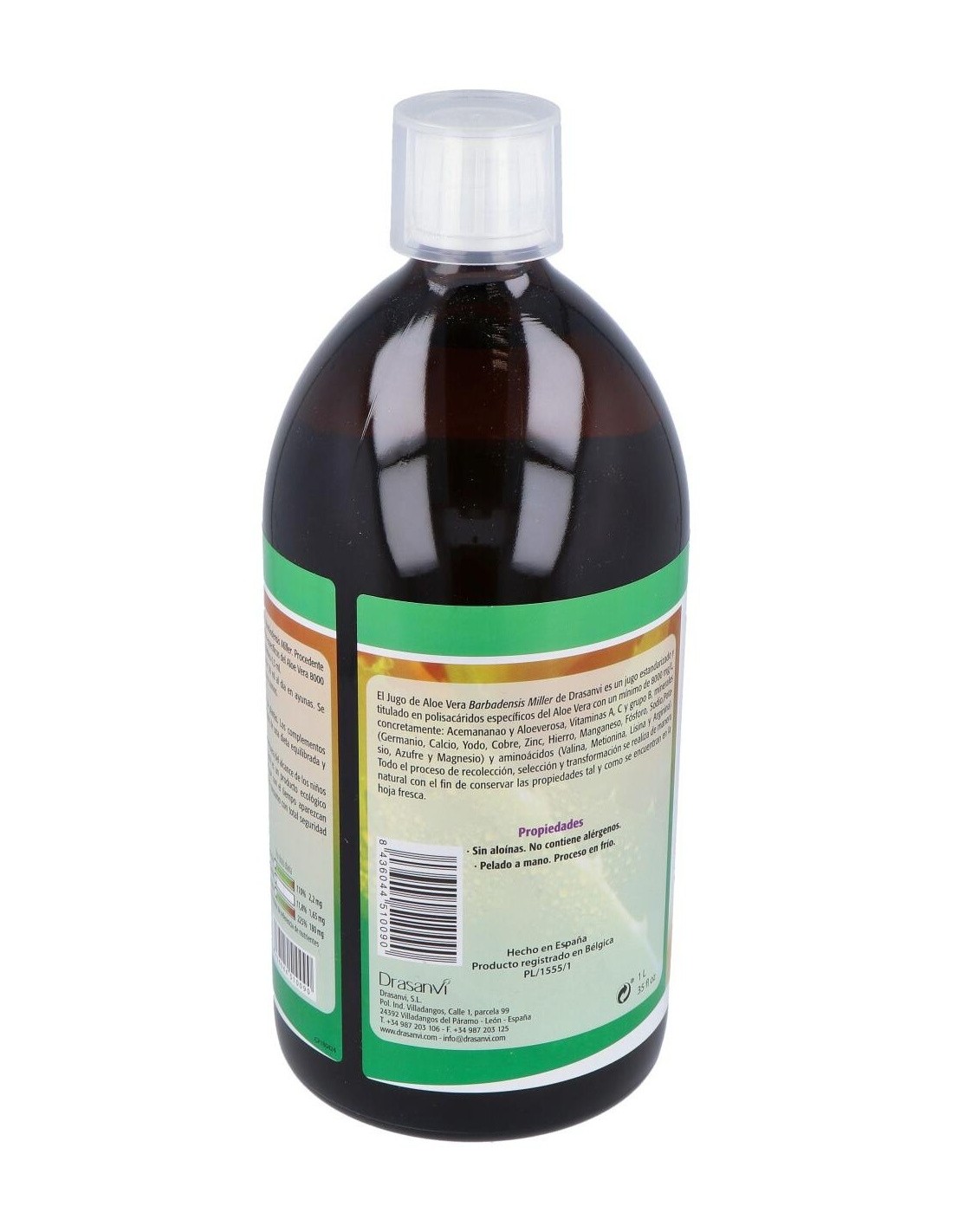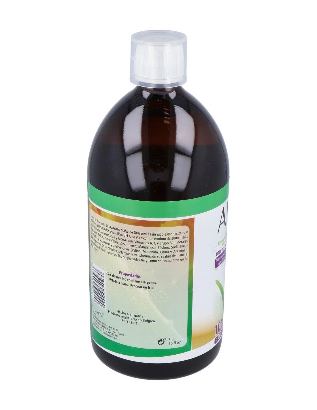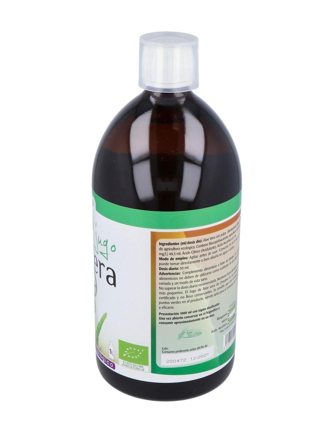Beneficios del Jugo de Aloe VeraEl Aloe Vera se puede ver como la reina de la plantas en medicina natural, posee una propiedades excepcionales. Es conocida como la planta de la inmortalidad en el antiguo egipcio , también se le ha llamado la planta biblica por la de veces que se menciona en el Antiguo como en el nuevo testamento, se relata que Nicodemo utilizó una mezcla de Aloe y mirra para embalsamar a Jesús. Se cree que el nombre de esta planta como la conocemos actualmente es de origen árabe , alloeh significa en arabe amargo y brillante. Su otro nombre sabila se le atribuye a una deformación del vocablo cabira, que significa en árabigo antiguo planta espinosa, Vera parece que puede provenir del latín y significa verdad, asi seria una amarga y brillante verdad la que esconde dentro. Los beneficios para la salud del jugo de aloe vera se conocen desde hace mucho tiempo. Históricamente se ha utilizado como un bálsamo calmante, siendo aplicado externamente en cortes, raspaduras y quemaduras. En la actualidad, el gel de Aloe Vera, se ha hecho muy popular por su amplia utilización en productos de belleza, higiene y cuidado corporal. Pero, su uso interno, también resulta muy beneficioso para nuestra salud, siendo un excelente complemento para nuestra dieta. El jugo de Aloe Vera contiene diecinueve aminoácidos, veinte minerales y doce vitaminas, por lo que es un excelente suplemento nutricional natural. Beber diariamente entre 50 y 100 ml. de jugo de Aloe Vera proporciona numerosos beneficios para la salud. Ayuda a dilatar los capilares y apoyar el crecimiento celular mejorando la circulación, regula la presión arterial, promueve la curación de huesos y articulaciones, cura los daños de tejidos internos y úlceras, fortalece el sistema inmunológico, mejora e incluso elimina el estreñimiento, defiende el organismo contra las bacterias, favorece la regulación de azúcar en la sangre, ayuda en la curación de la psoriasis reduciendo la picazón, y, además, proporciona una sensación de bienestar y energía. Son conocidas las propiedades de la planta de aloe vera para bajar el colesterol malo o LDL y mantener sano el organismo. El aloe vera a través de sus componentes logra actuar contra las altas concentraciones de colesterol en sangre.Composición activa por dosis diaria (50 ml):Aloe vera con pulpa (hoja)(aloe barbadensis miller. Procedente de agricultura ecológica. Contiene Mucopolisacáridos específicos del aloe vera 8.000 mg/L) 49,5 ml, acidulante (ácido cítrico), antioxidante (ácido ascórbico).Modo de empleo:Tomar 50 ml al día en ayunas. Se puede tomar directamente o disuelto en agua o zumo.Presentación:Botella de 1 litro.Recomendaciones y advertencias:No contiene aloína. No contieen alérgenos. Pelado a mano. Proceso en frio.