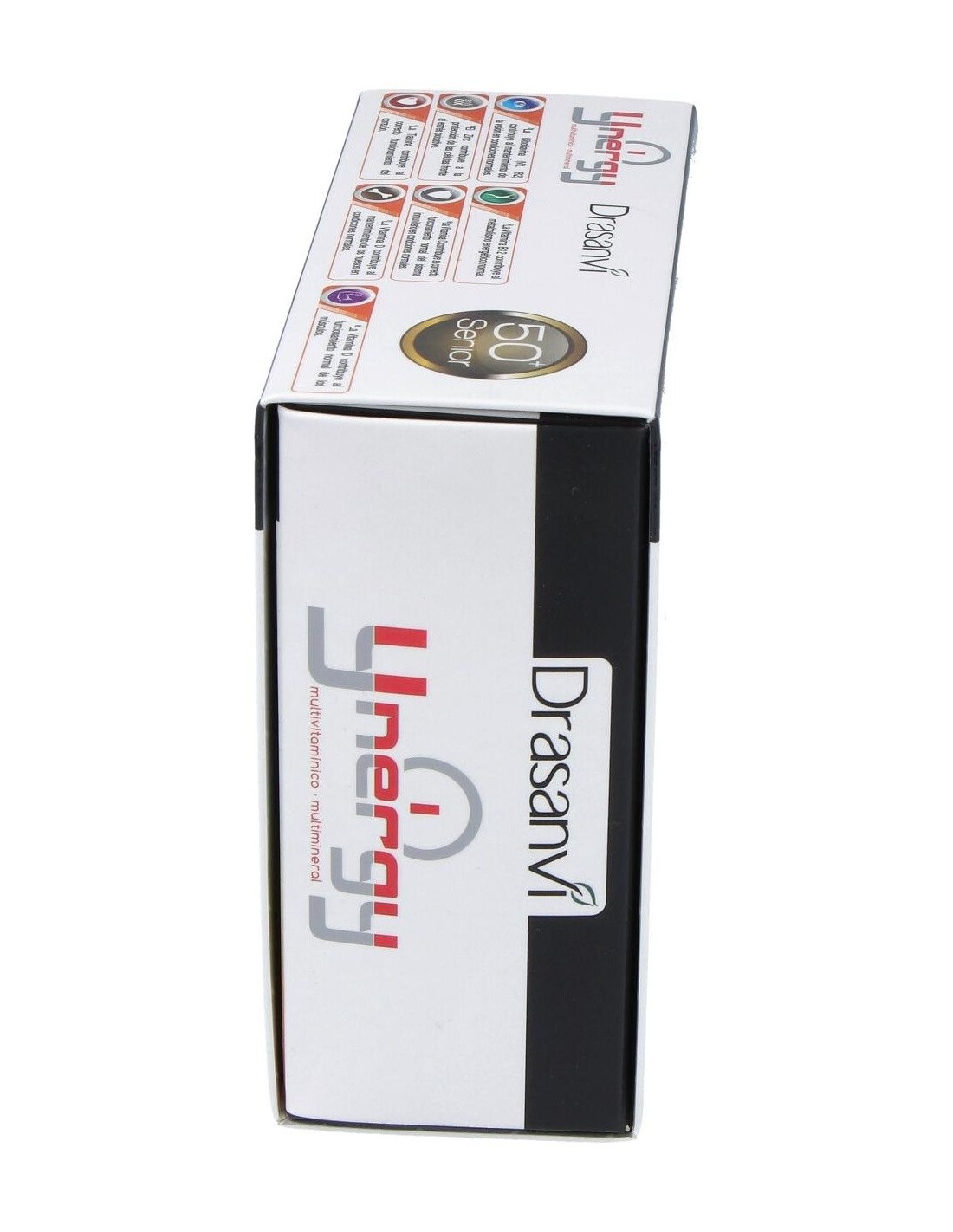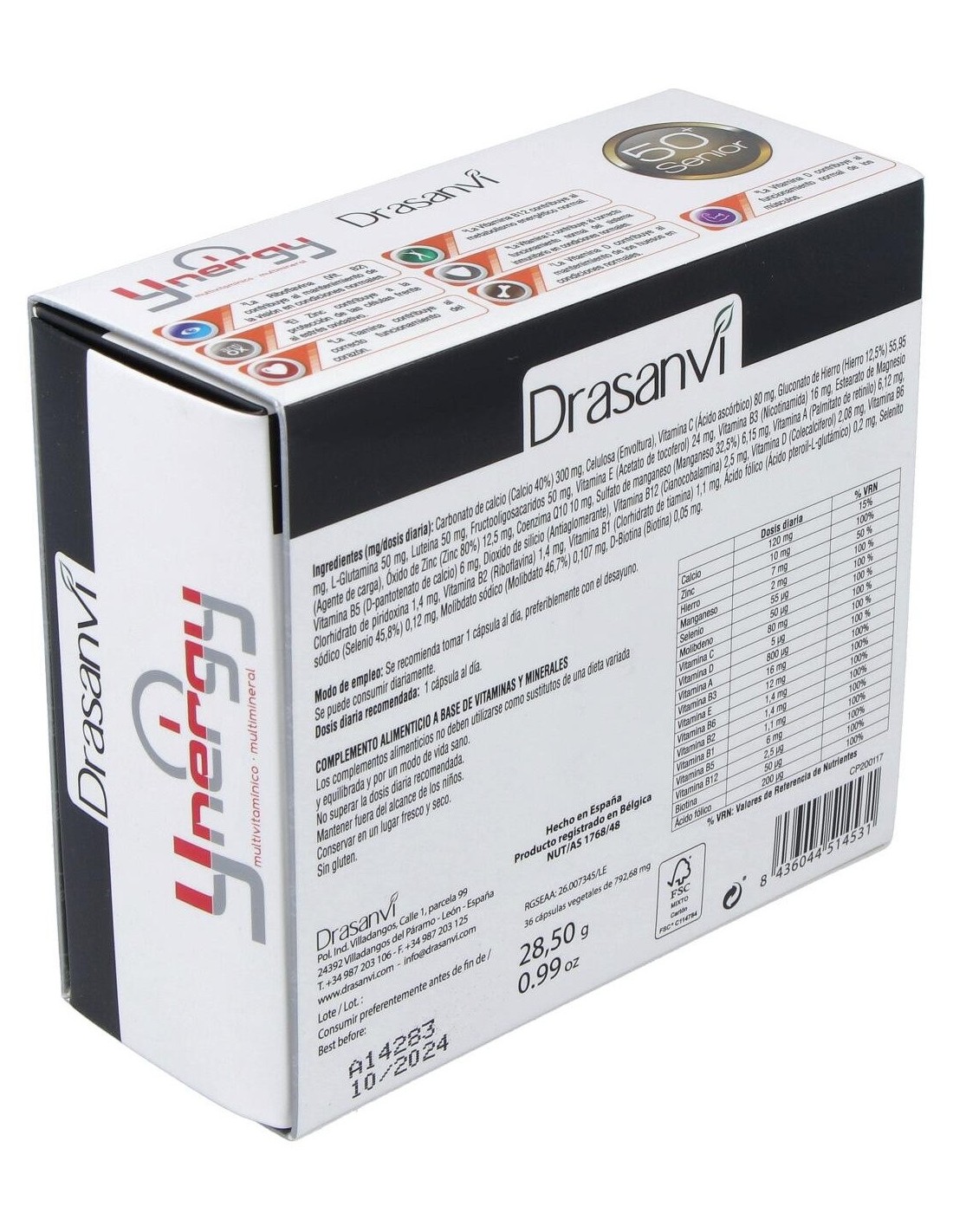 Drasanvi Ynergy Senior 36 Cáps es complemento multivitamínico y multimineral formulado especialmente para hombres mayores de 50 años. Su excelente combinación de 21 vitaminas y minerales se ha enriquecido con Luteina y Coenzima Q10 ya que destaca por su obtención de energía. No solo eso, sino que también mejora la vista, fortalece el sistema inmunitario y favorece el buen funcionamiento de los huesos, los músculos y el corazón.