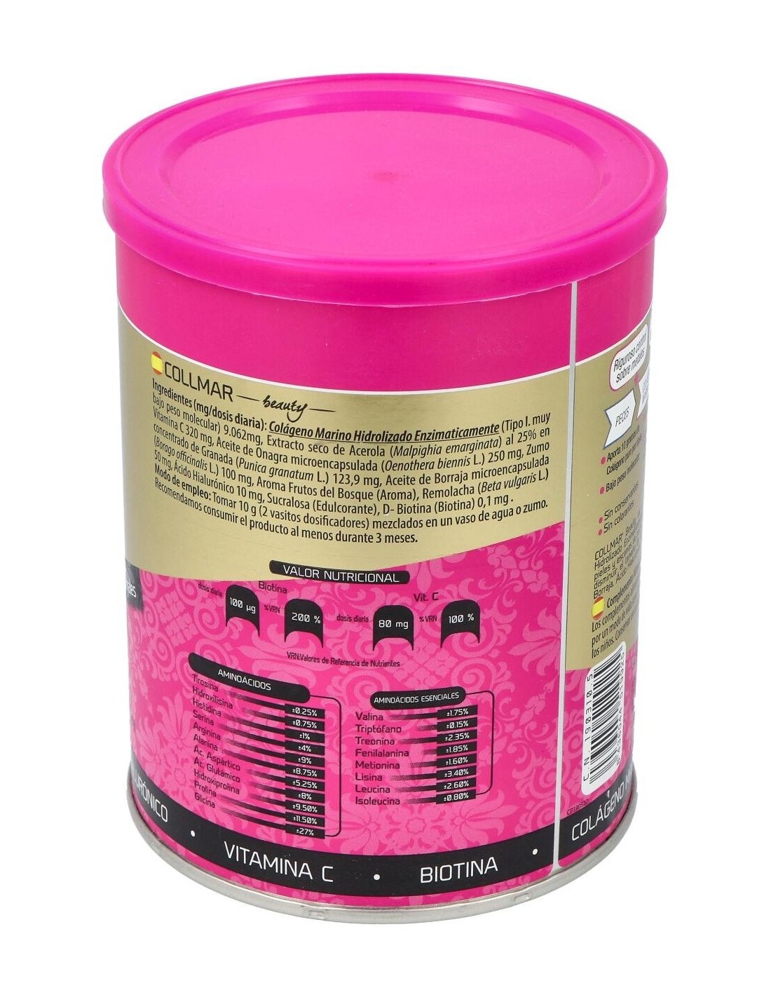 Collmar® Beauty, una estudiada composición, cuyo ingrediente principal es el colágeno marino hidrolizado, el cual ha sido reforzado con vitaminas como la biotina y la vitamina C, ácidos insaturados provenientes del aceite de borraja y onagra, y potenciado con las propiedades de la granada. Propiedades de los principios activos: