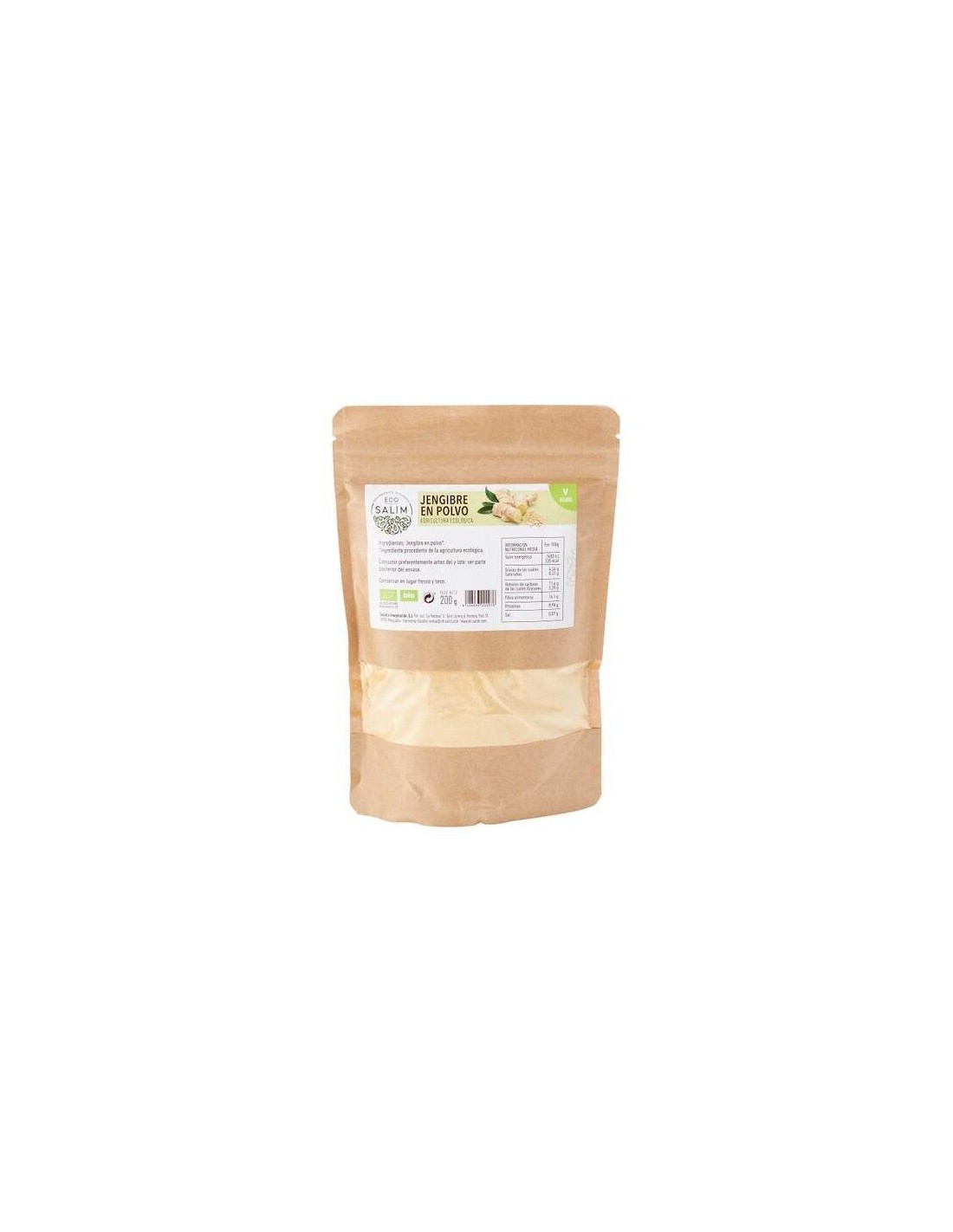 ECO SALIMJengibre en polvo ecológico presentado en un envase de 200g. Puede agregarse a postres, galletas, guisos, salsas, panes, etc.
