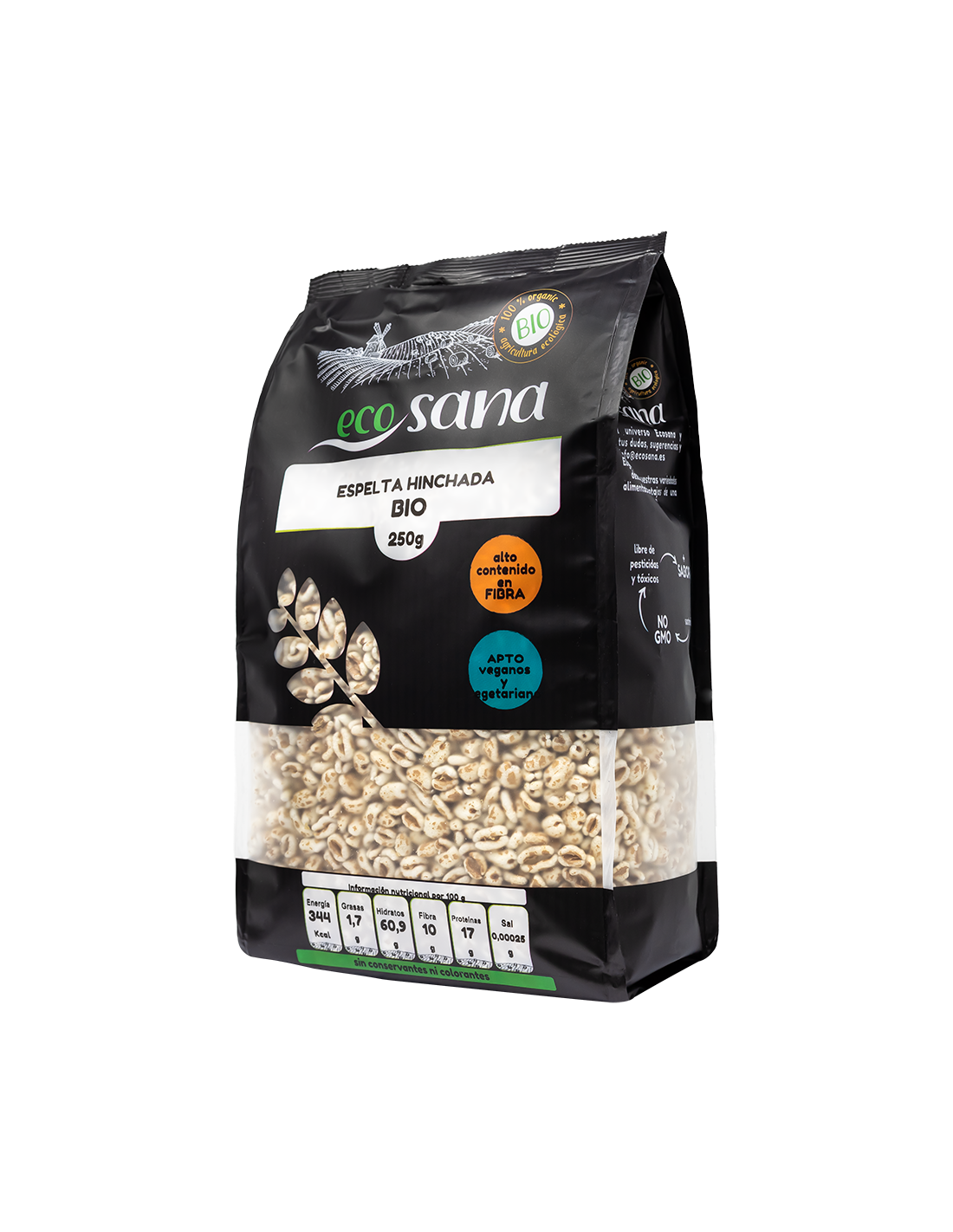 - Espelta hinchada procedente de cultivo biológico, que aporta una textura ligera y crujiente para enriquecer desayunos y snacks.