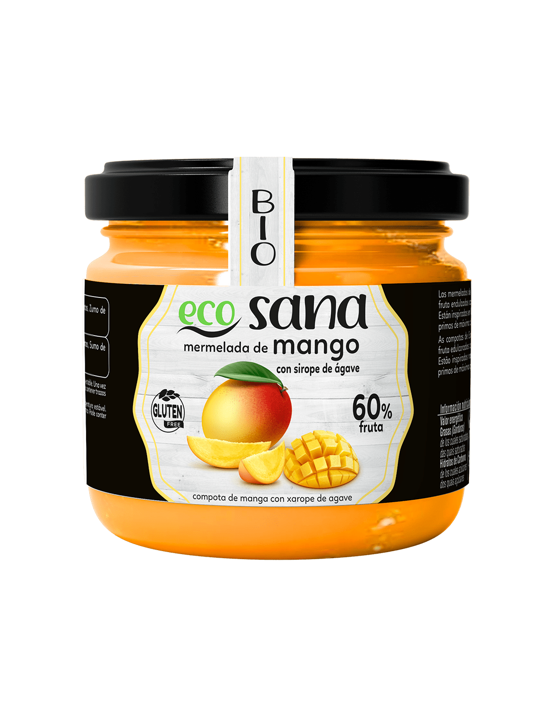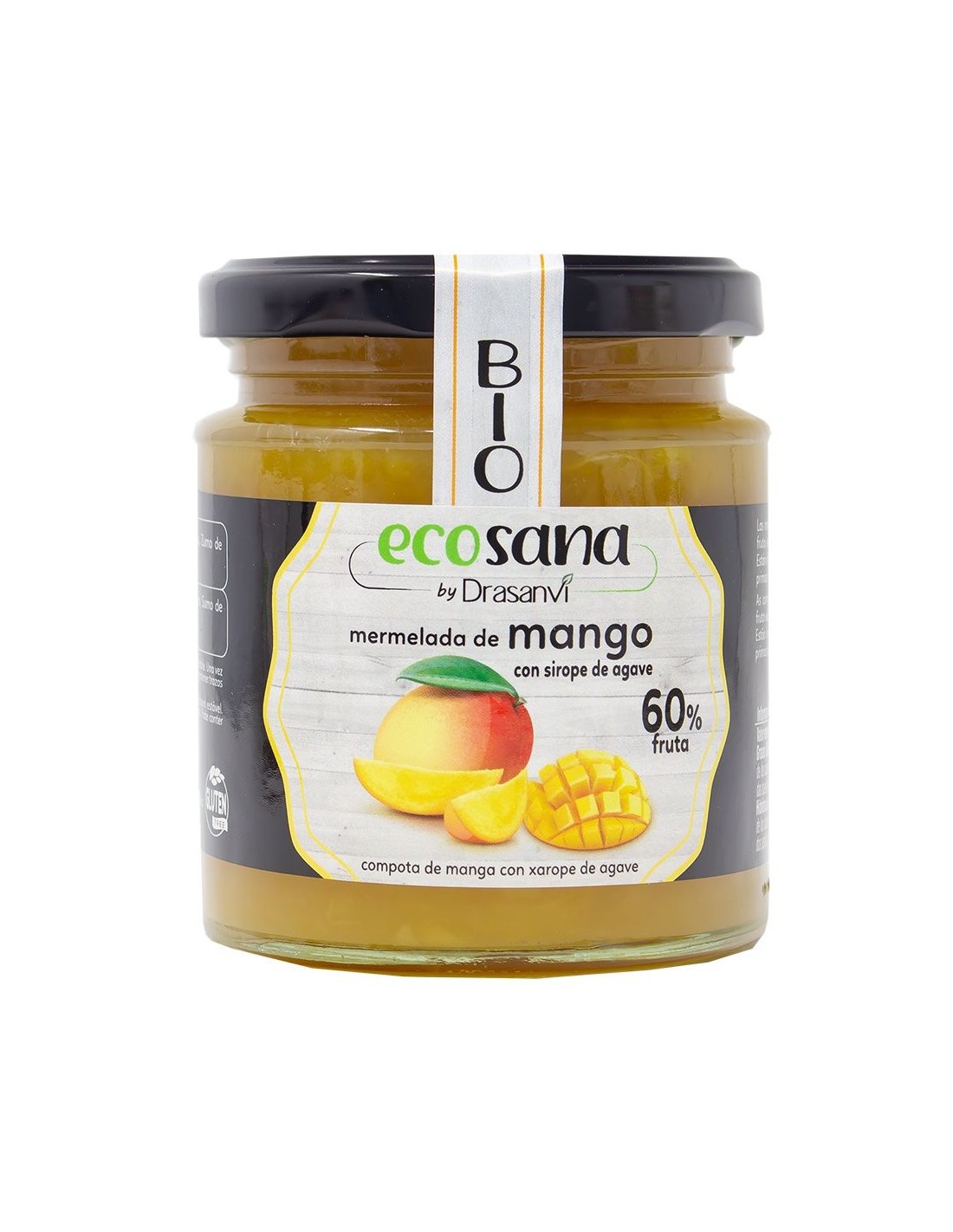 ECOSANA DRASANVIIngredientes:Mango* (60%), Sirope de ágave*, Pectina de frutas, Zumo de limón*. (*) Procedente de agricultura ecológica.Valor nutricional por 100 gram
