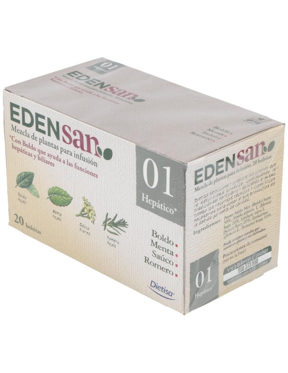 EDENSAN®Edensan 01 Filtros Infusiones 20Uds es una infusión a base de una mezcla de plantas naturales que favorece las funciones hepáticas y biliares del organismo.Este producto contiene boldo, un ingrediente natural que tienen propiedades beneficiosas para la salud del hígado y la vesícula biliar: efecto diurético y efecto estimulante de la secreción de bilis, componente necesario para que las digestiones se produzcan adecuadamente.