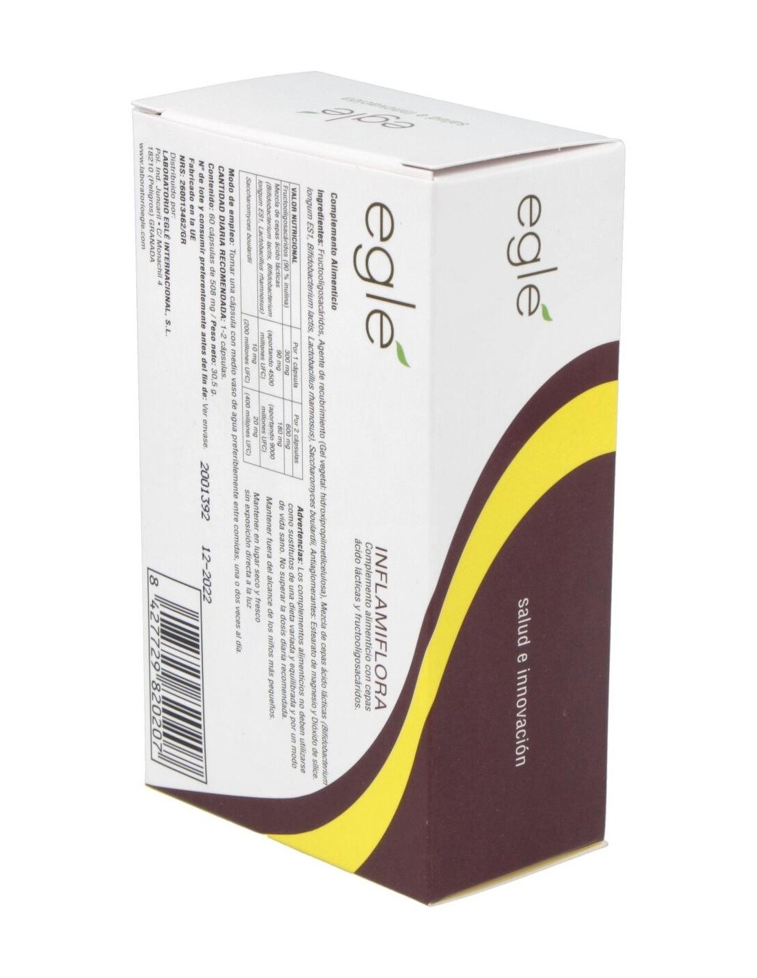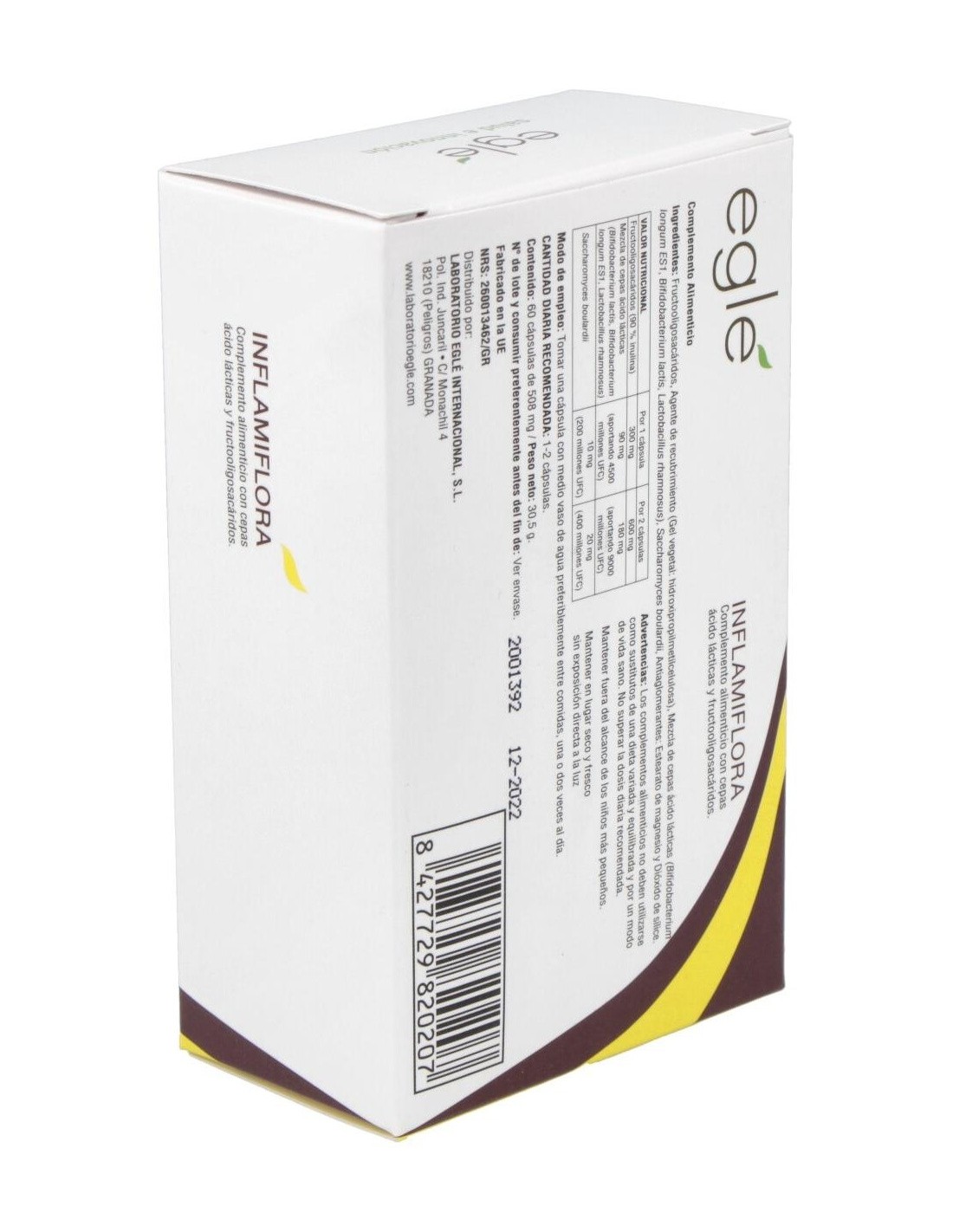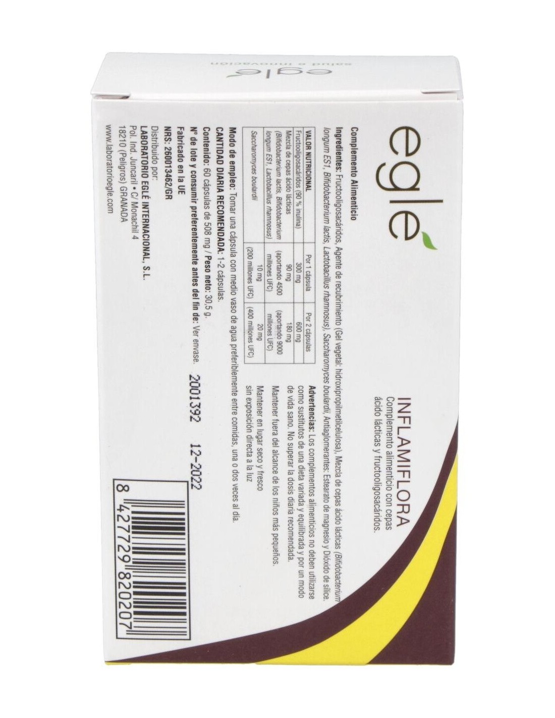 EGLEInflamiflora es un complemento alimenticio que contiene cuatro cepas probióticas: Bifidobacterium longum ES1, Bifidobacterium lactis, actobacillus rha