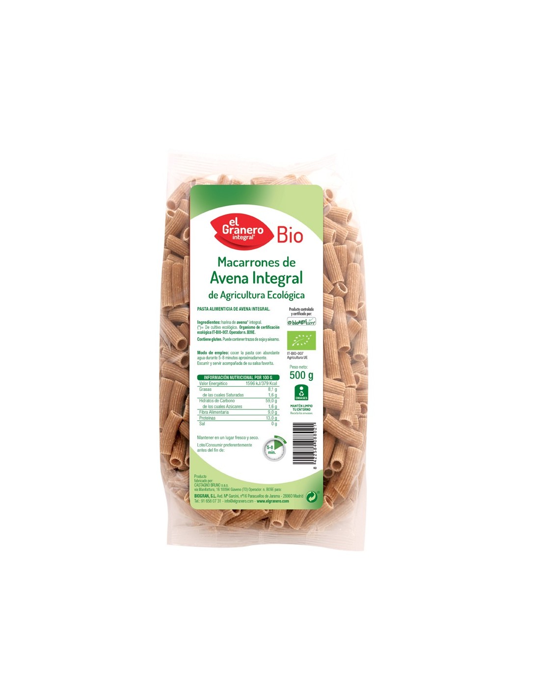 Macarrones De Avena Integral Bio, 500 G de El Granero Integr
