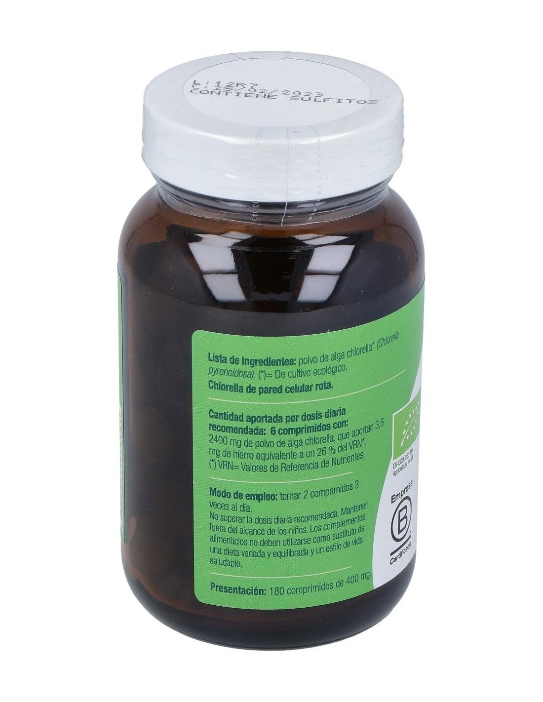 Composición por 6 comprimidos:2.400 mg de polvo de alga de chlorella de cultivo ecológico (de pared celular rota). Modo de empleo:Tomar 2 comprimidos 3 veces al día. Presentación:Bote de 180 comprimidos.