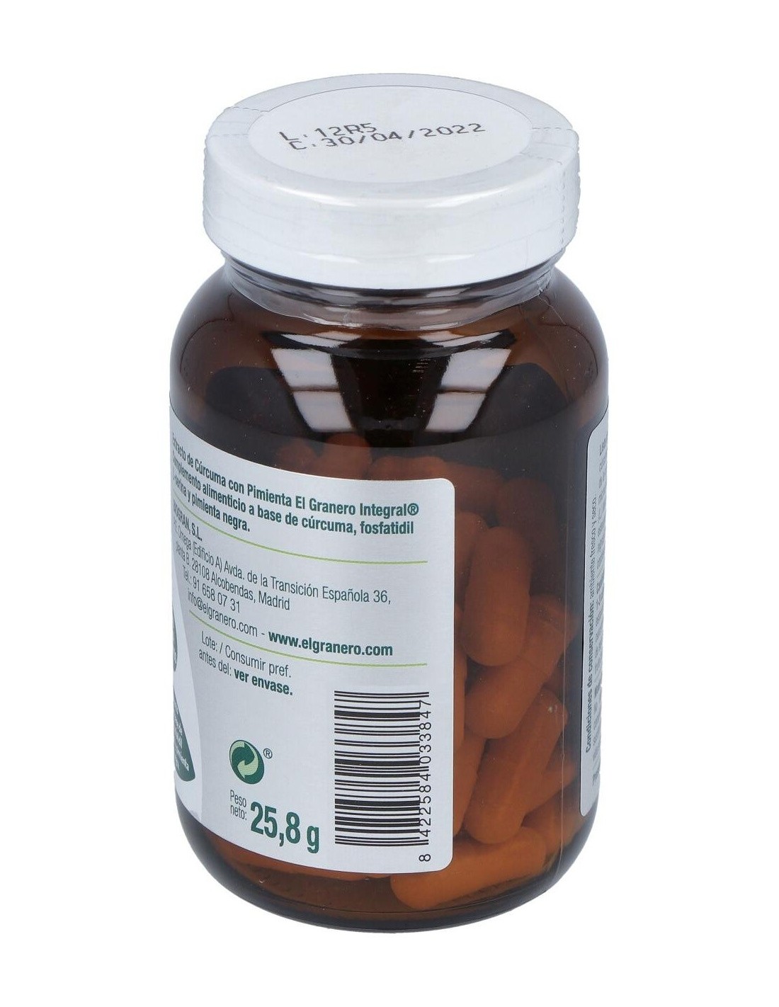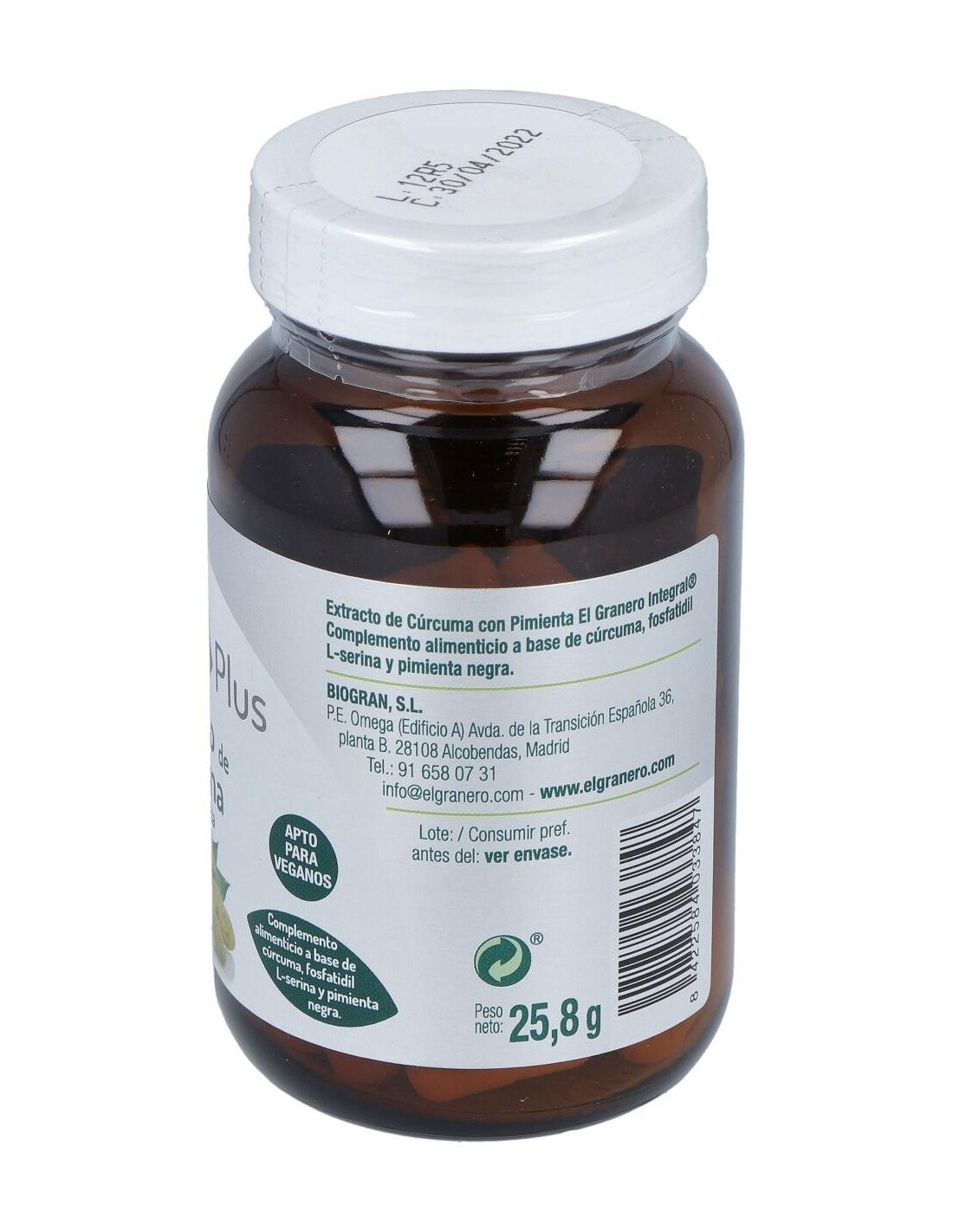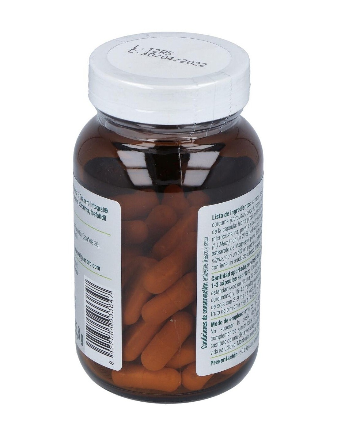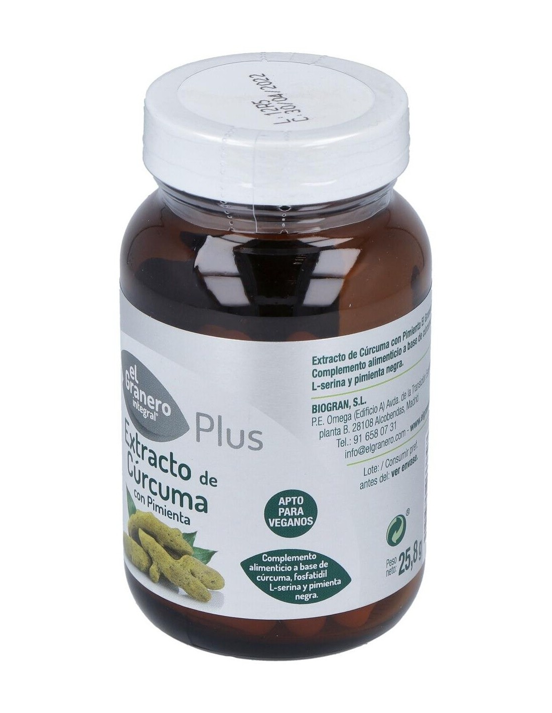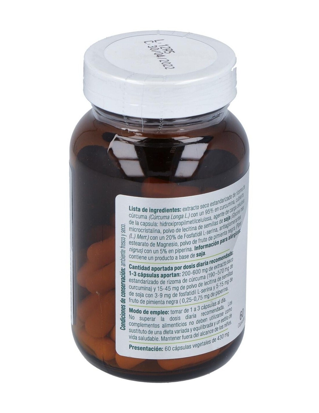 Ingredientes:Extracto seco estandarizado de rizoma de cúrcuma (Cúrcuma Longa L.) con un 95% en curcumina, cubierta de la capsula: hidroxipropilmetilcelulosa, agente de carga celulosa microcristalina, polvo de lecitina de semillas de soja (Glycine max (L.) Merr.) con un 20% de Fosfatidil L-serina, antiaglomerantes estearato de Magnesio, polvo de fruto de pimienta negra (Piper nigrus) con un 5% en piperina. Modo de empleo:Tomar 2 cápsulas al día. Presentación:Envase de 60 perlas.Recomendaciones y advertencias:Apto para veganos.