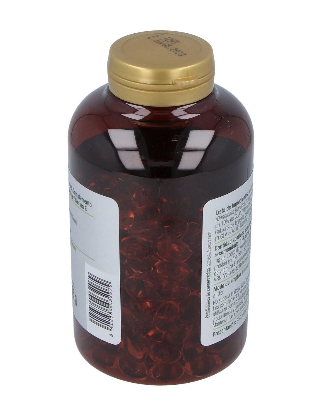 Aceite de semillas de onagra (Oenothera biennis L.) de primera presión en frío, con un 10% de GLA, Vitamina E natural (D-alfa-tocoferol). Cubierta de la perla: gelatina, Estabilizante glicerol. GLA = Ácido Gamma Linolénico.