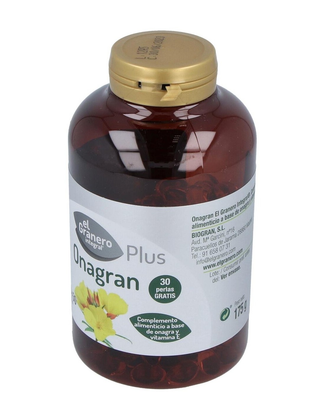 Onagran Plus de Granero Integral es un suplemento alimenticio que integra ácidos grasos esenciales, es decir, que el cuerpo humano no es capaz de producir de manera natural. Este producto contiene onagra, una semilla que ayuda a aliviar los síntomas asociados al síndrome premenstrual, tanto a nivel físico como a nivel mental. Además, es una fuente natural de ácidos grasos omega 6 y también tiene numerosos efectos beneficiosos para la piel. Este producto es apto para todo tipo de personas, y es especialmente recomendable para ser usado por mujeres durante la menstruación, ya que tiene propiedades analgésicas que controlan los dolores producidos por la regla. Este suplemento no tiene ninguna contraindicación. No obstante, los complementos alimenticios no deben utilizarse como sustituto de una dieta variada y equilibrada y un estilo de vida saludable.