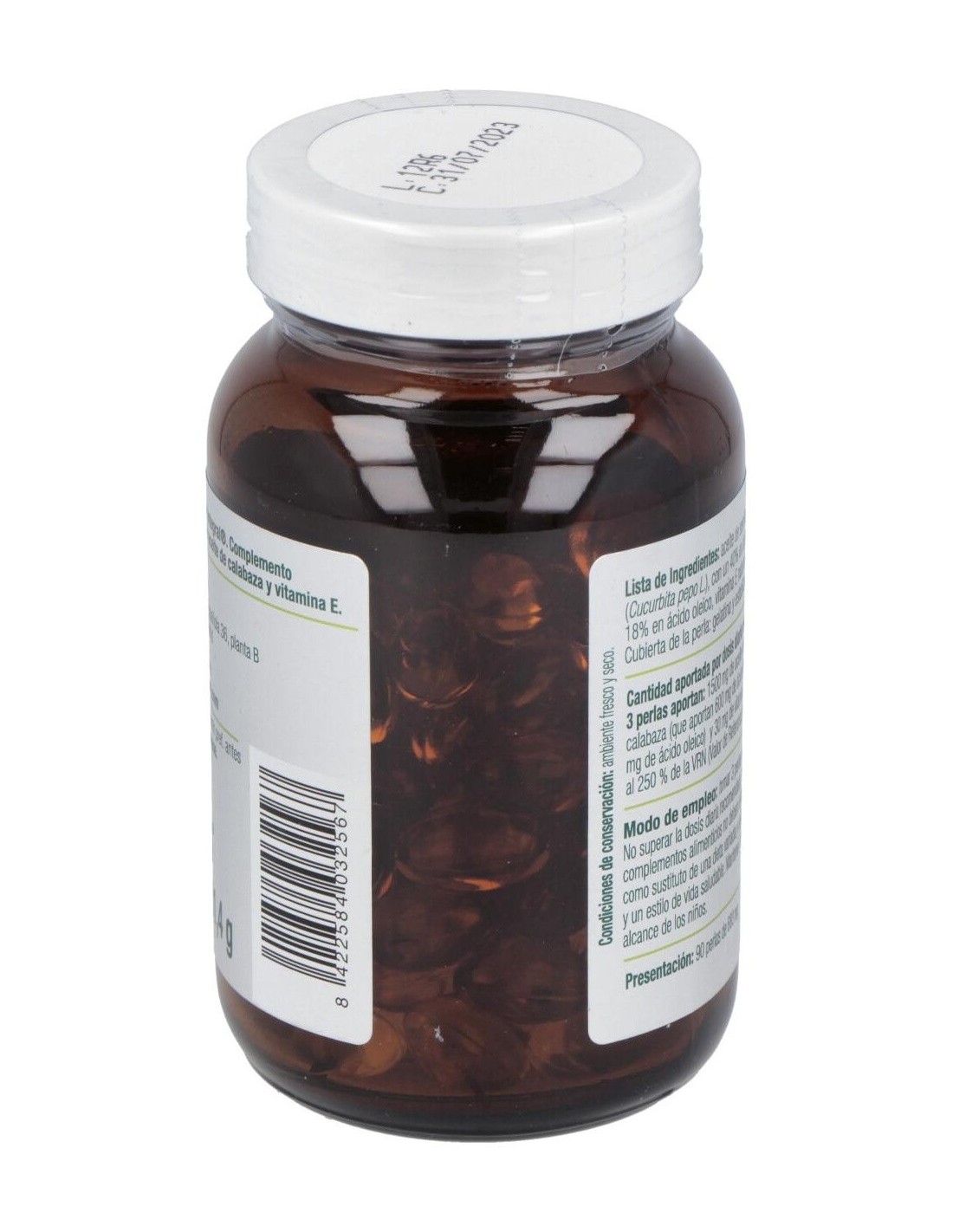 Las semillas de calabaza contienen hasta un 35% de aceite, rico en ácidos grasos insaturados como oleico y linoleico y prótidos con un contenido elevado en aminoácidos esenciales. Sus acciones más importantes son las derivadas del compuesto curcubitina, la cual bloquea la división de las células glandulares de la próstata, siendo además activa como antiinflamatorio en caso de edemas al ser capaz de interferir en la biosíntesis de protaglandinas. La Comisión E alemana autoriza su utilización en las molestias miccionales asocidas al crecimiento prostático benigno, ya que además disminuye la inflamación de la vejiga. Crecimiento de la próstata.La próstata es un órgano con crecimiento continuado durante la vida del hombre. Al crecimiento mayor de lo deseado se le conoce como hiperplasia. Se produce por un aumento relativo de los andrógenos sobre los estrógenos. Este desequilibrio produce la síntesis de factores de crecimiento celular, lo que conlleva el progresivo aumento de la glándula. Sobre este aumento influyen factores como la edad, obesidad, hipertensión, intolerancia a los glúcidos por resistencia a la insulina o alteraciones lipídicas. Puede aparecer antes de los 50 años, pero la incidencia es superior al 50% en los varones de 60 años y de un 90% en los 85 años. En algunas personas produce síntomas derivados de la comprensión del conducto de salida de la orina (uretra prostática) y del mayor esfuerzo que debe hacer la vejiga para realizar la micción: