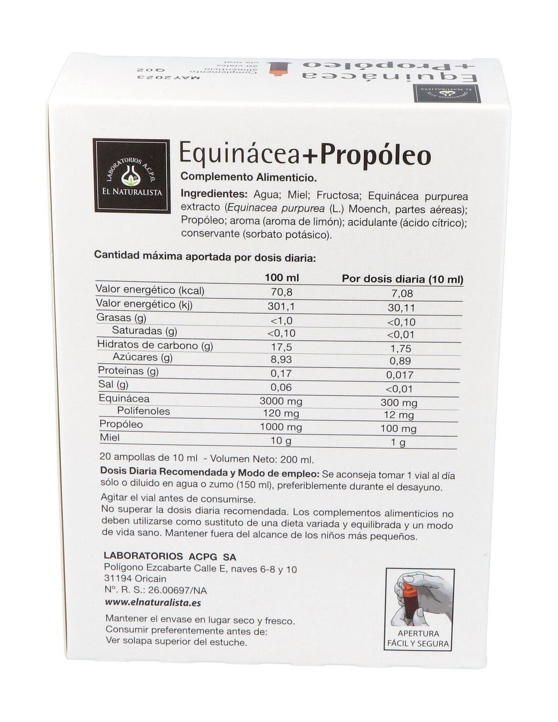 EL NATURALISTAComplemento alimenticio en viales que combina las propiedades de la equinácea, con los beneficios del propóleo. Ambos compuestos se utilizan tradicionalmente para estimular las defensas del organismo.