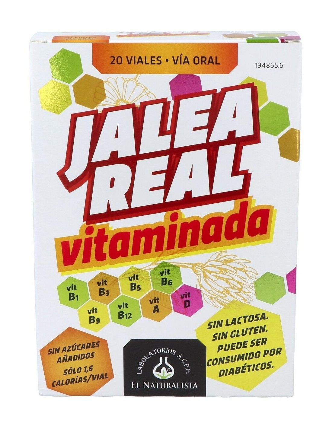 Complemento alimenticio compuesto por Jalea Real liofilizada y 8 Vitaminas: B1, B3, B5, B6, B9, B12, A y D. Puede ser consumido por diabéticos debido a su bajo contenido en azúcares totales (0,09 g/vial).