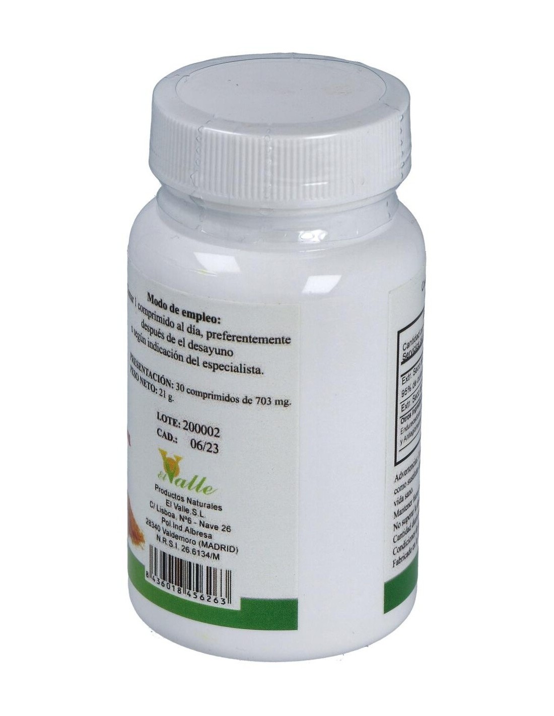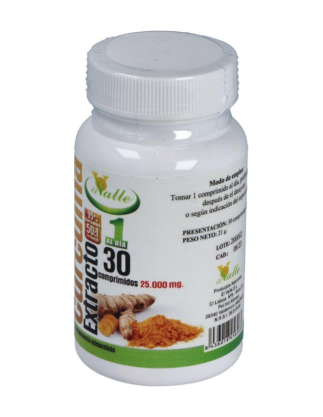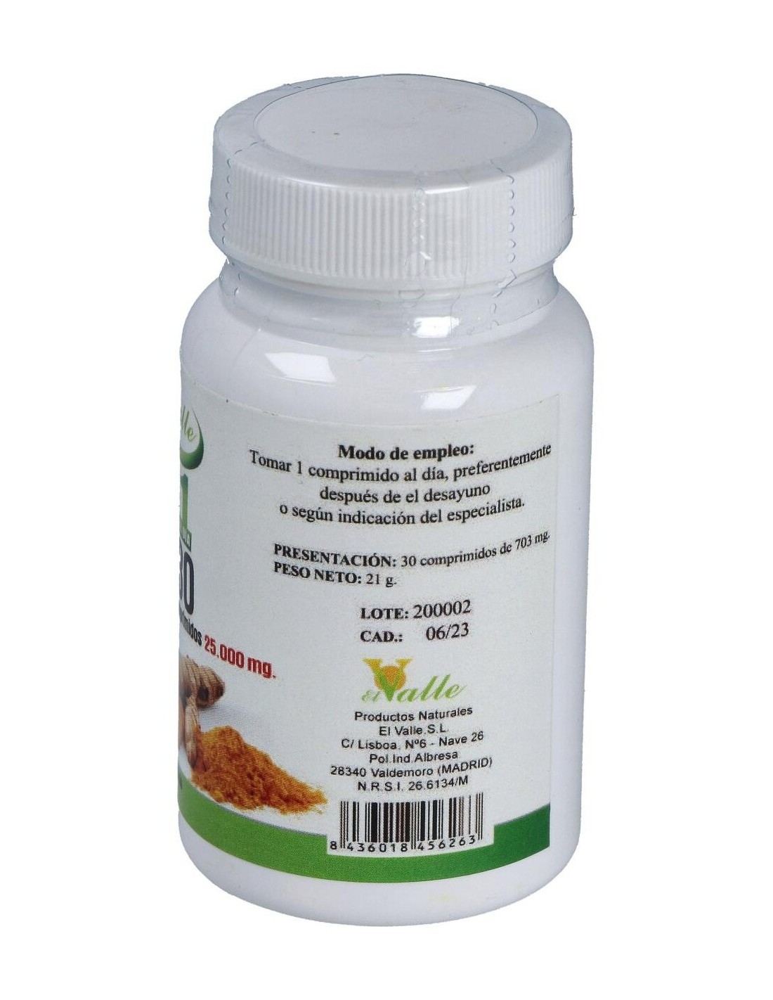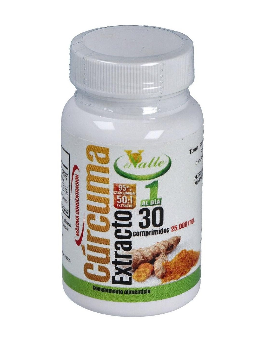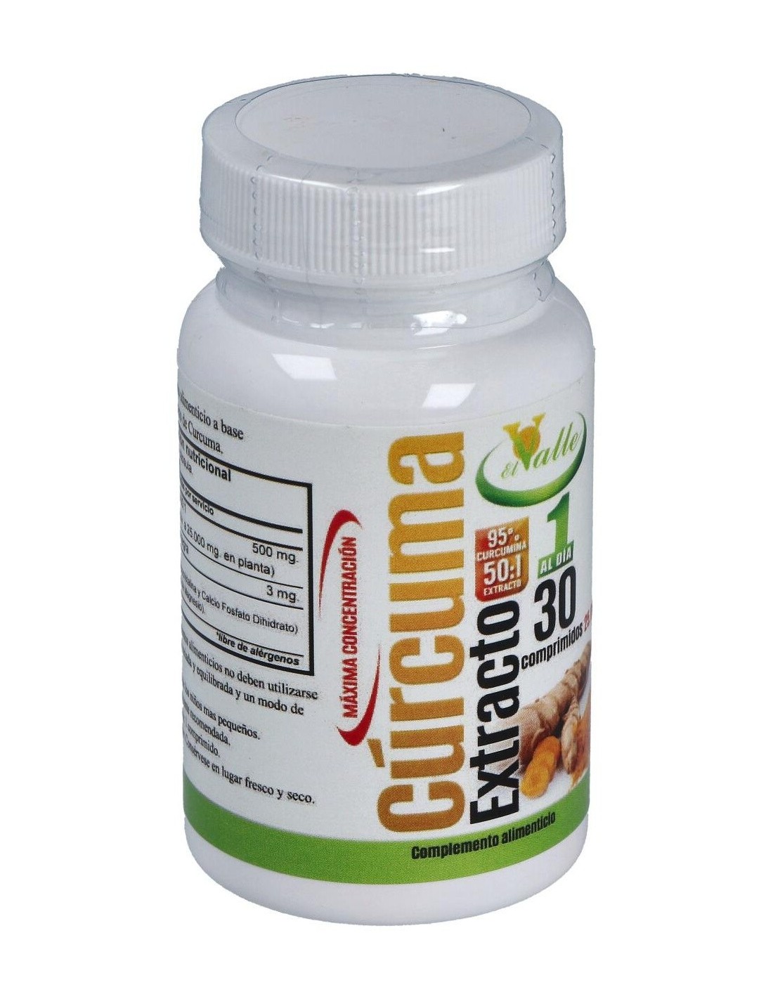 EL VALLEComplemento alimenticio en forma de comprimidos, elaborado a base de extractos de raíz de cúrcuma, que favorece el buen funcionamiento del sistema digestivo y de la función hepática.Aporta propiedades antioxidantes, ayuda a aliviar y prevenir malas digestiones, dolores estomacales, cólicos y flatulencia, así como a reforzar el sistema inmunitario y a mantener la buena salud cardiovascular.