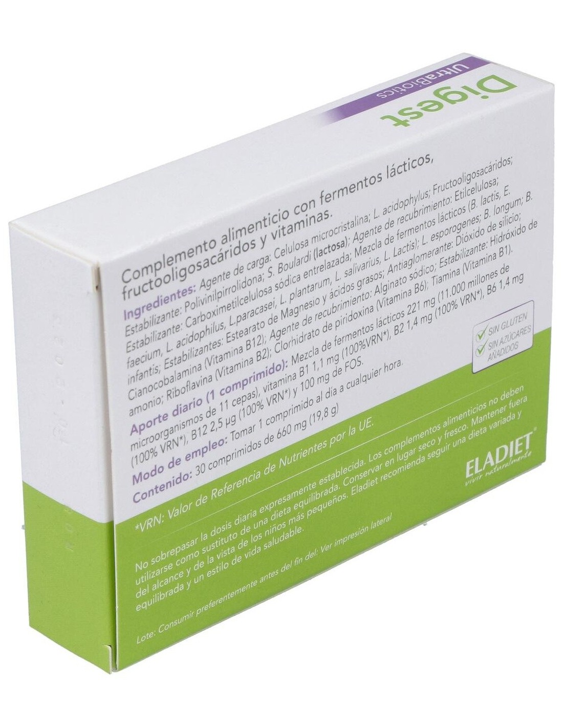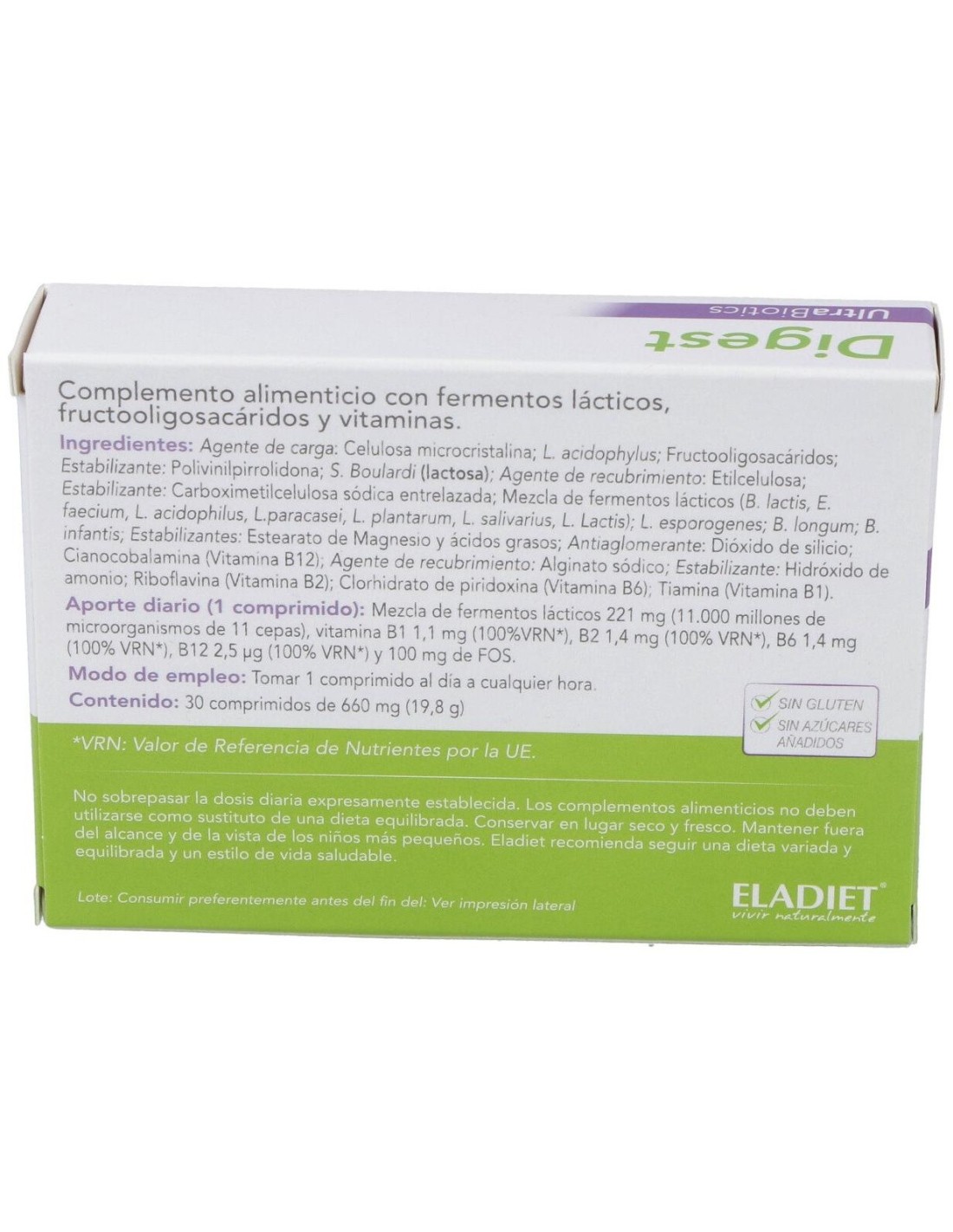 Ingredientes:Agente de carga: Celulosa microcristalina; L. acidophylus; Fructooligosacáridos; Estabilizante: Polivinilpirrolidona; S. Boulardi (lactosa); Agente de recubrimiento: Etilcelulosa; Estabilizante: Carboximetilcelulosa sódica entrelazada; Mezcla de fermentos lácticos (B. lactis, E. faecium, L. acidophilus, L.paracasei, L. plantarum, L. salivarius, L. Lactis); L. esporogenes; B. longum; B. infantis; Estabilizantes: Estearato de Magnesio y ácidos grasos; Antiaglomerante: Dióxido de silicio; Cianocobalamina (Vitamina B12); Agente de recubrimiento: Alginato sódico; Estabilizante: Hidróxido de amonio; Riboflavina (Vitamina B2); Clorhidrato de piridoxina (Vitamina B6); Tiamina (Vitamina B1). Modo de empleo:Tomar 1 comprimido al día o cualquier hora. Presentación:Envase de 30 comprimidos.Recomendaciones y advertencias:No contiene gluten ni azúcares añadidos.