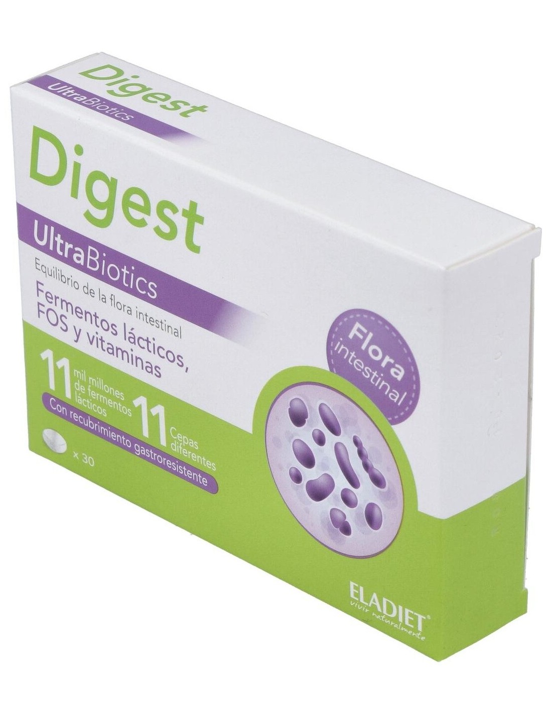 La flora intestinal es un complejo ecosistema compuesto por varios cientos de especies de microorganismos, la mayoría de ellos del género bacteria. Este ecosistema incluye algunos micrroganismos considerados patógenos pero tambiñen contiene numerosas especies capaces de promover efectos beneficiosos para la salud. El conjunto de estas bacterias forman la flora intestinal. Los tipos de microorganismos presentes en la flora intestinal tiene una regulación multifactorial. Los factores intrínsecos que influyen en la flora normal son temperatura, pH, motilidad, concentración de oxígeno, recambio epitelial... Tambiñen hay factores exógenos que regulan el balance de la microbiota como la dieta, antiobióticos, edad... Debido a los múltiples factores condicionantes de la flora, ésta se encuentra en un delicado balance con su hospedero. Para mantener las propiedades benéficas de la flora intestinal se han creado los probióticos, dirigidos a restaurar la flora bacteriana normal. Los microorganismos no sorpotan la condición ácida del estómago y mueren en gran cantidad durante la digestión. UltraProbiotics, gracias a su cobertura gastroresistente, consigue mantener vivos a todos los microorganismos para que puedan ejercer su acción en el intestino. UltraProbiotics contiene 11 cepas y 11 billones de microorganismos mejorando la versatilidad de acciones y adaptabilidad en el medio de la flora. UltraProbiotics aporta también Frustotoligosacáridos que aumentan la supervivencia y la proliferación de las bacterias benéficas. Composición activa por comprimido: