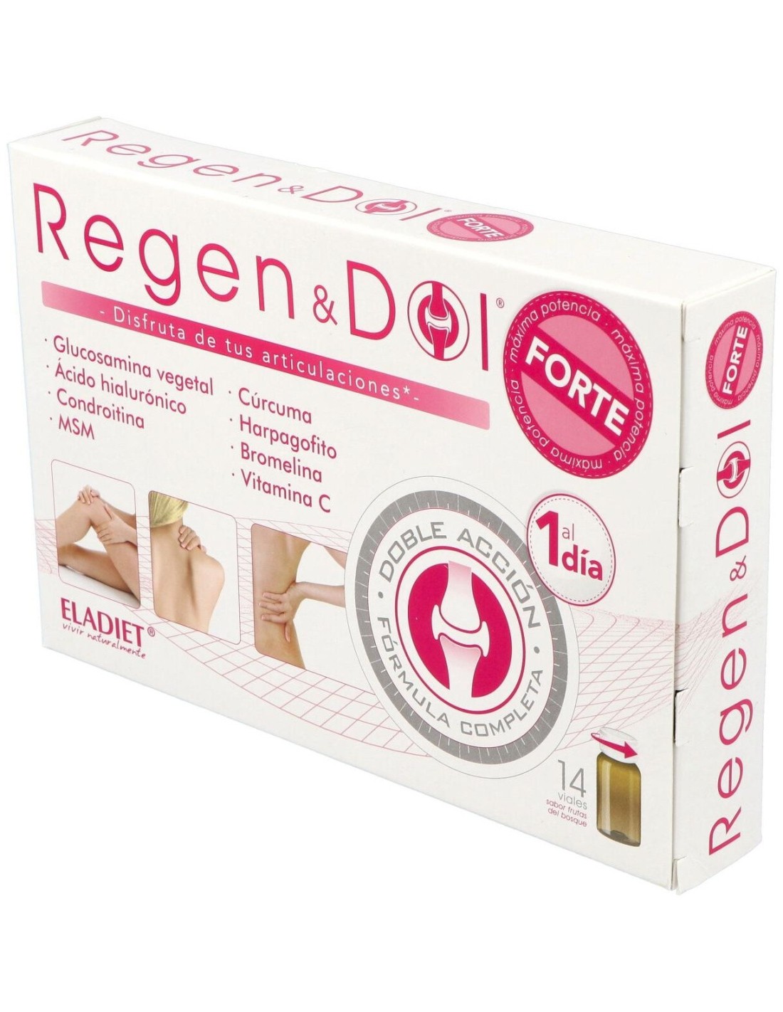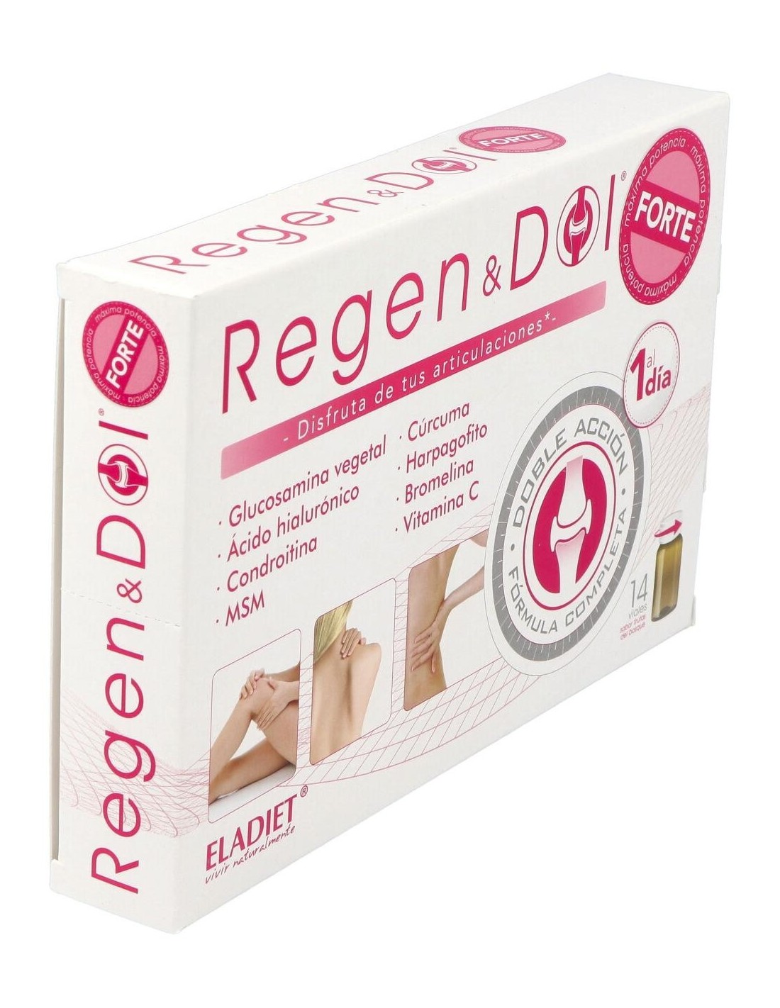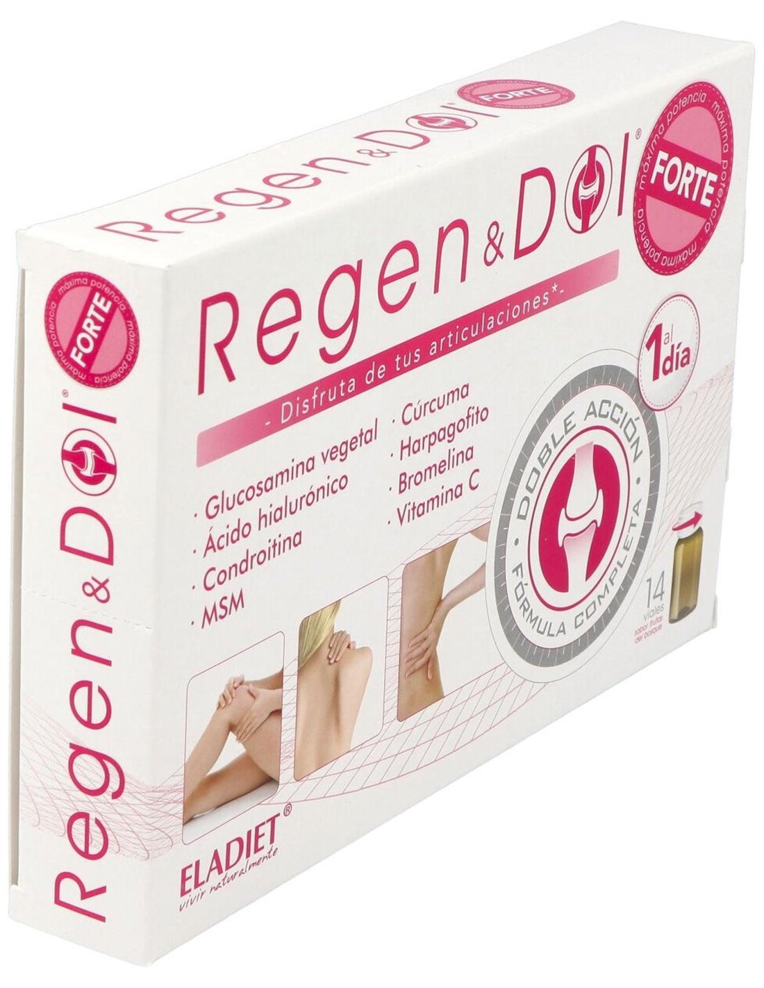 Regen&Dol Forte (Regendol Forte) es un producto basado en componentes de la matriz del cartílago articular como la glucosamina, condroitina, MSM y el ácido hialurónico, estos complementos ayudan ante el desgaste articular a los que les han añadido extractos de plantas antiinflamatorias para paliar el dolor. Composición por vial: