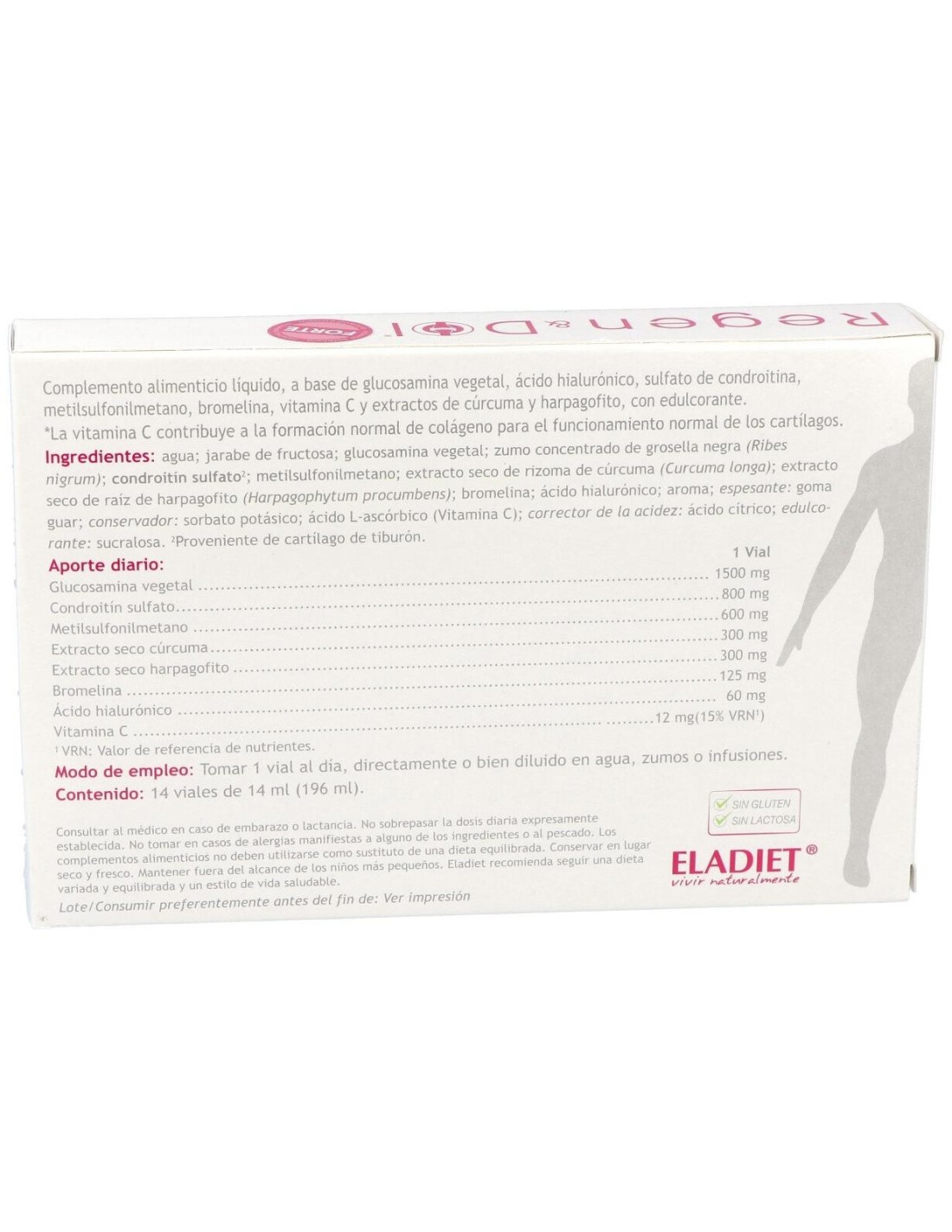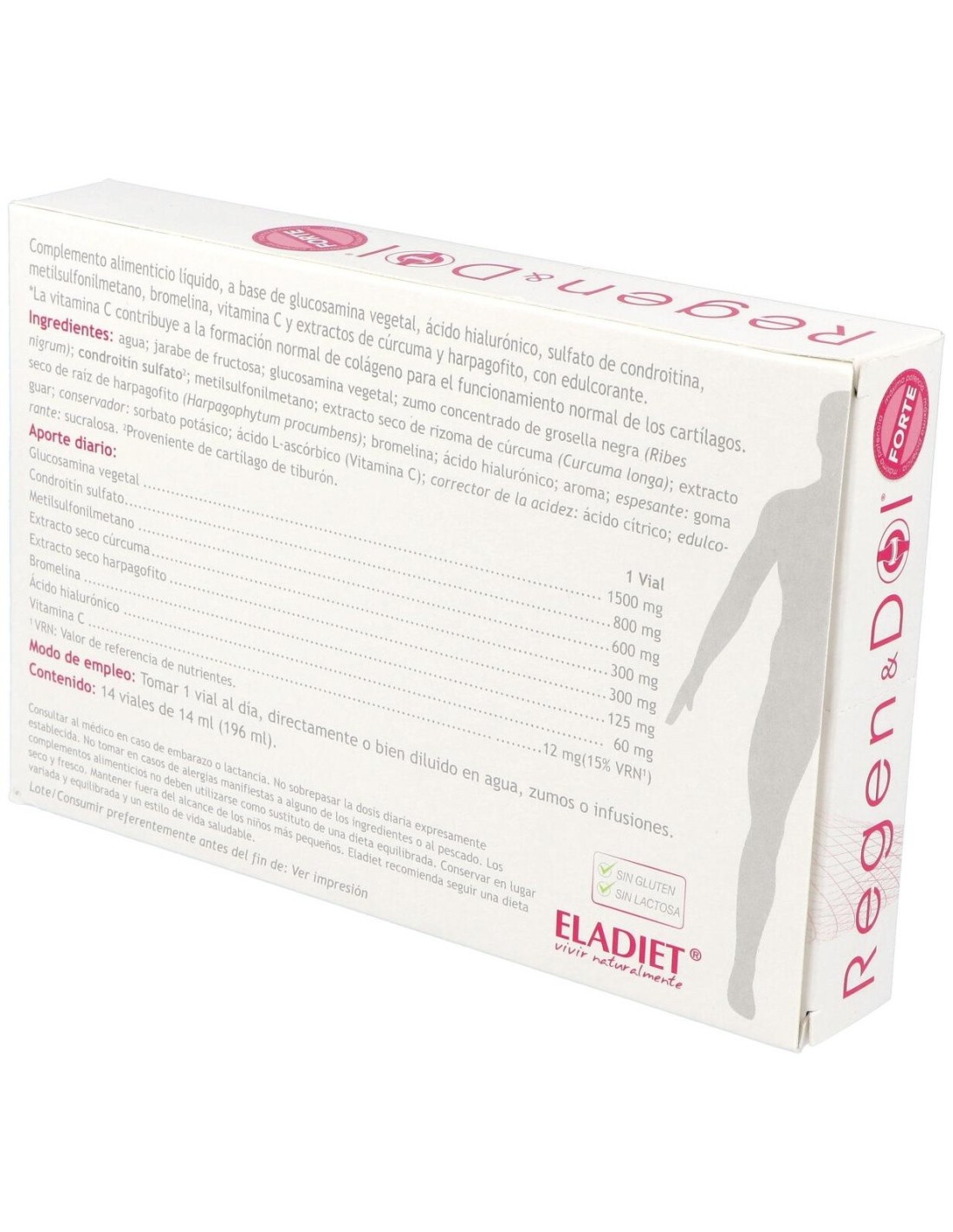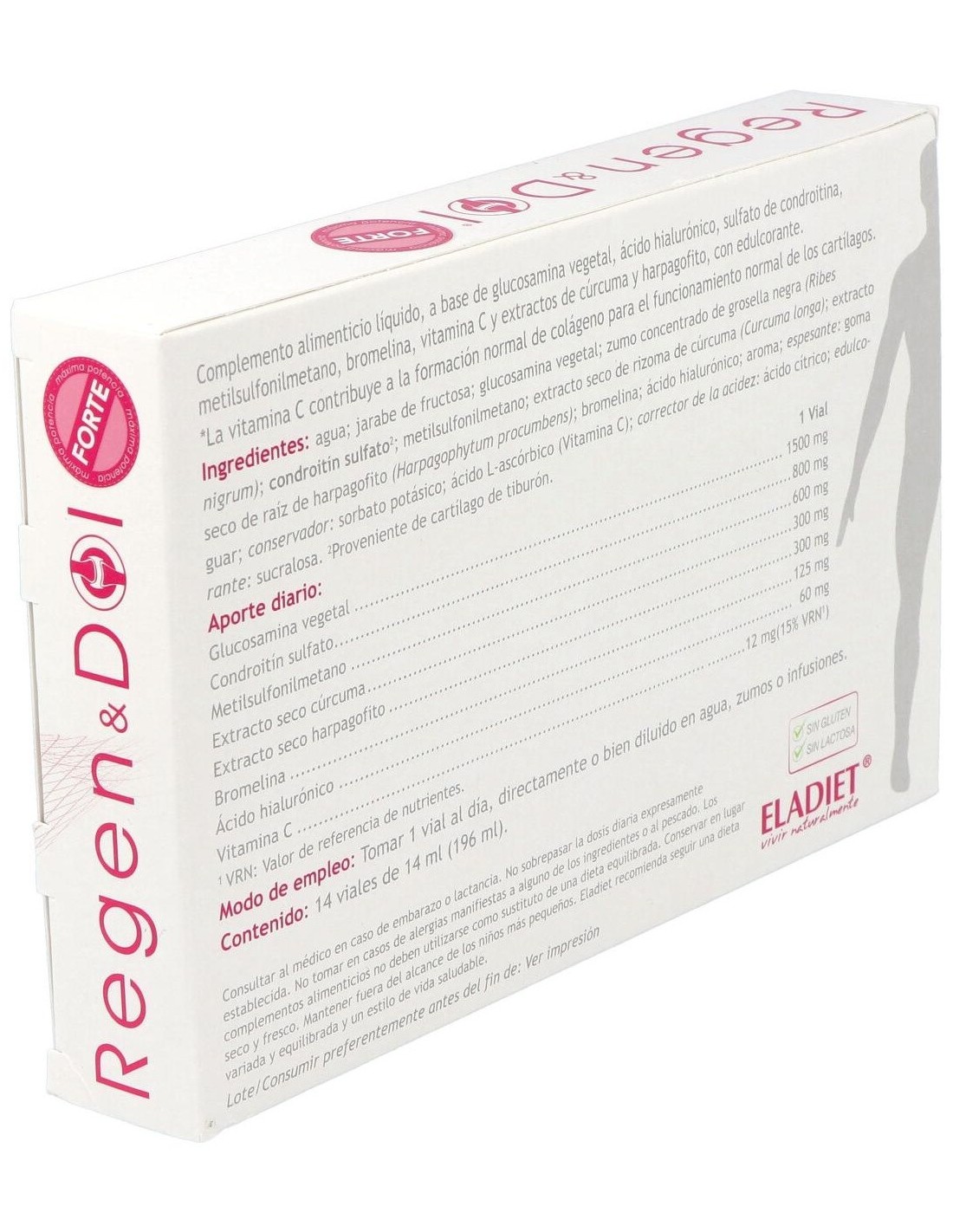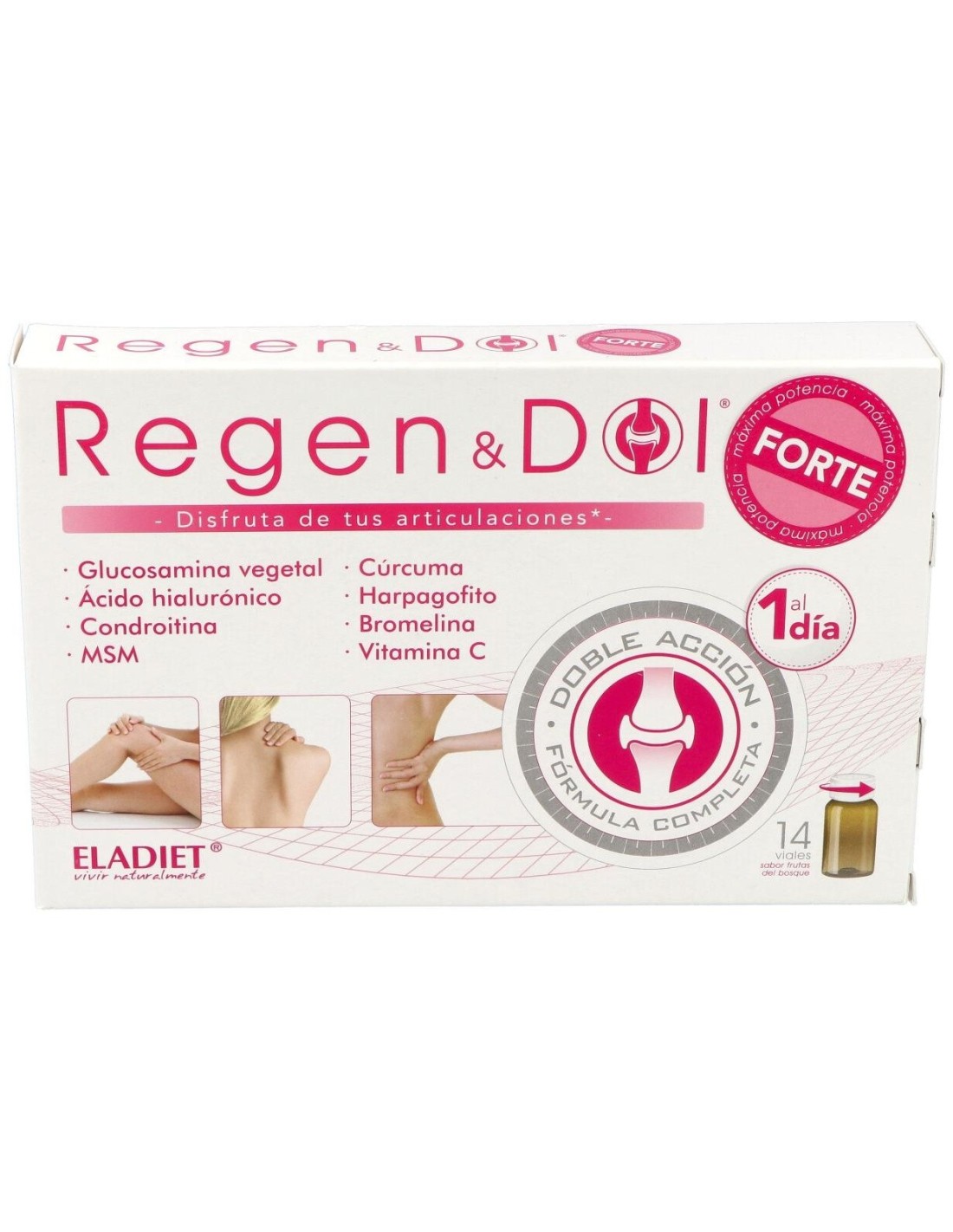 Regen&Dol Forte (Regendol Forte) es un producto basado en componentes de la matriz del cartílago articular como la glucosamina, condroitina, MSM y el ácido hialurónico, estos complementos ayudan ante el desgaste articular a los que les han añadido extractos de plantas antiinflamatorias para paliar el dolor. Composición por vial: