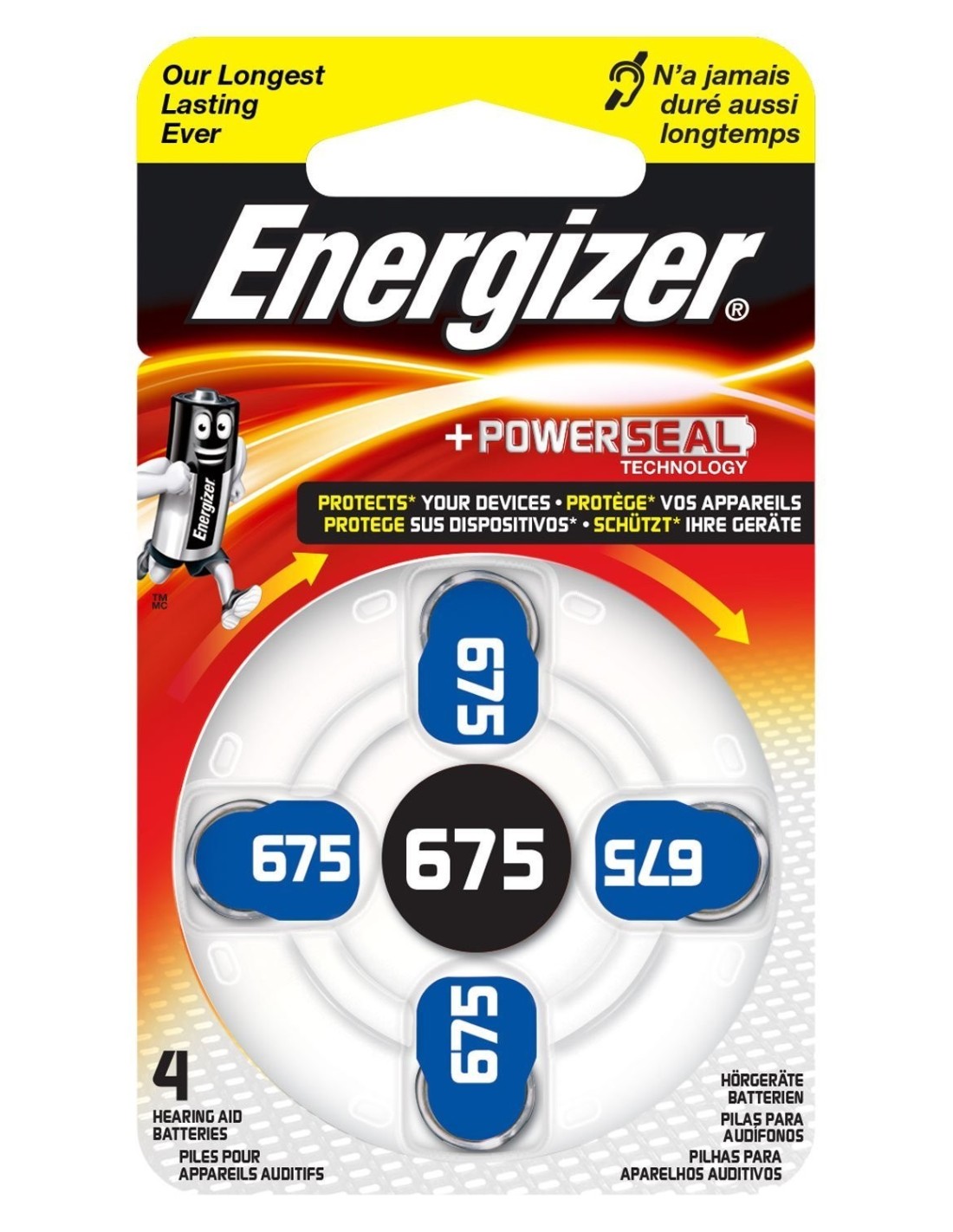 ENERGIZERPilas de audífono Energizer® con la tecnología PowerSeal para proteger los dispositivos. Las lengüetas más largas marcadas claramente con el tamaño y color facilitan la compra, la manipulación y la inserción.