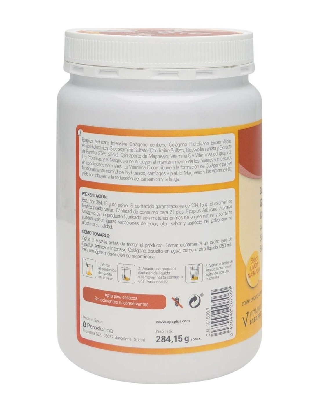 Epaplus Arthicare Colágeno Intensive 284g: es un complemento alimenticio con Colágeno hidrolizado bioasimilable, Glucosamina, Condroitina, Ácido Hialurónico, Silicio, Boswellia y Vitaminas C, B1, B2 y B6.