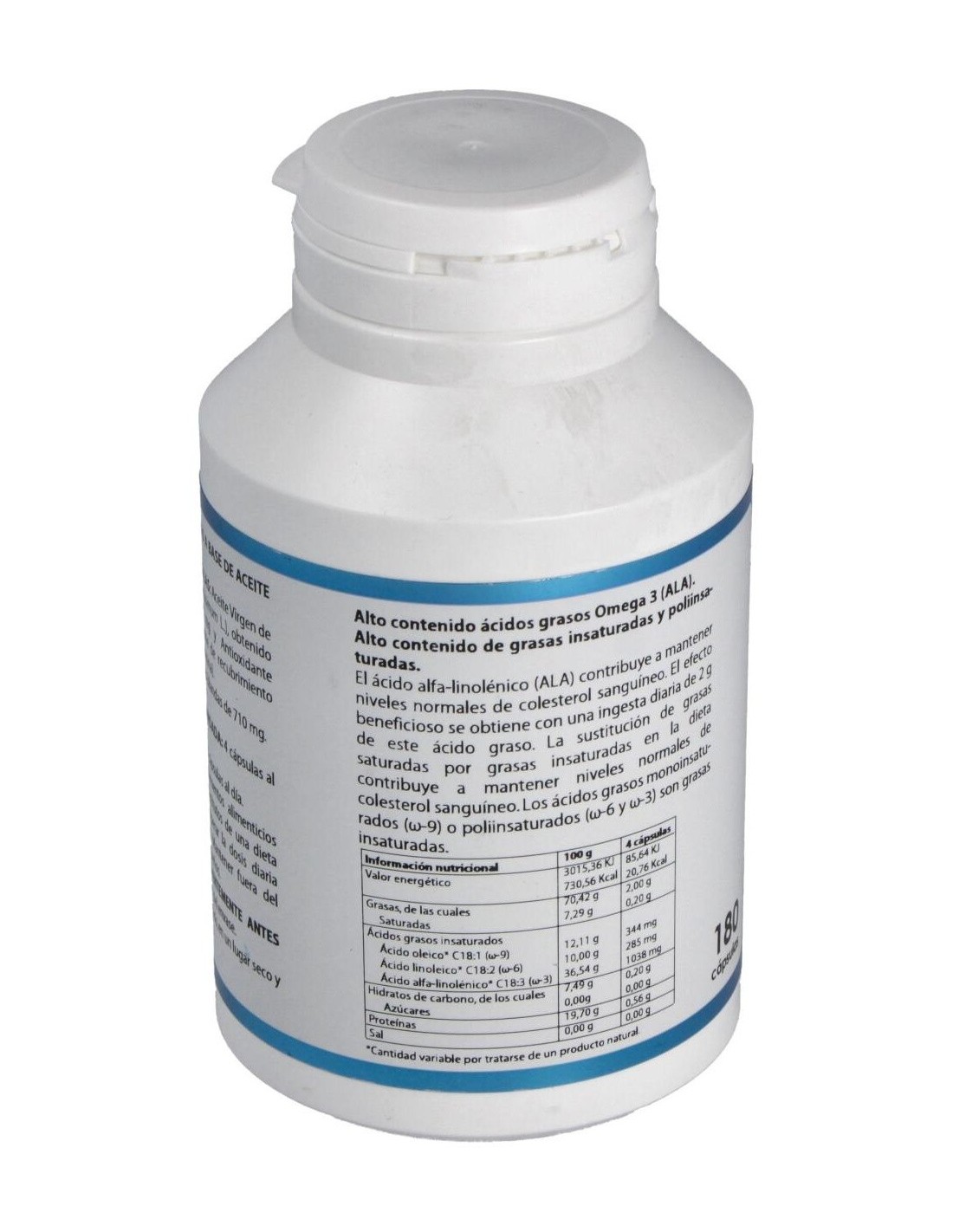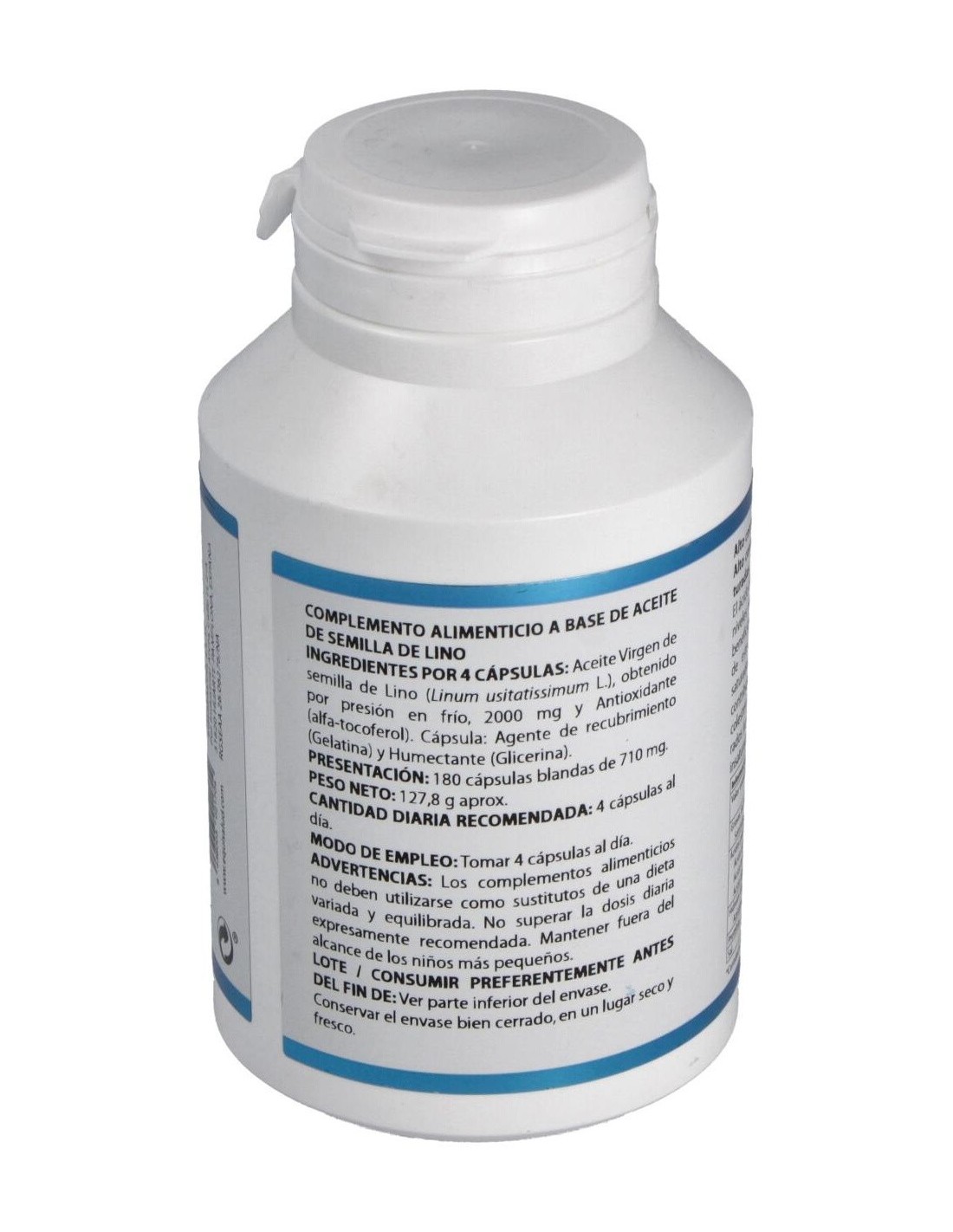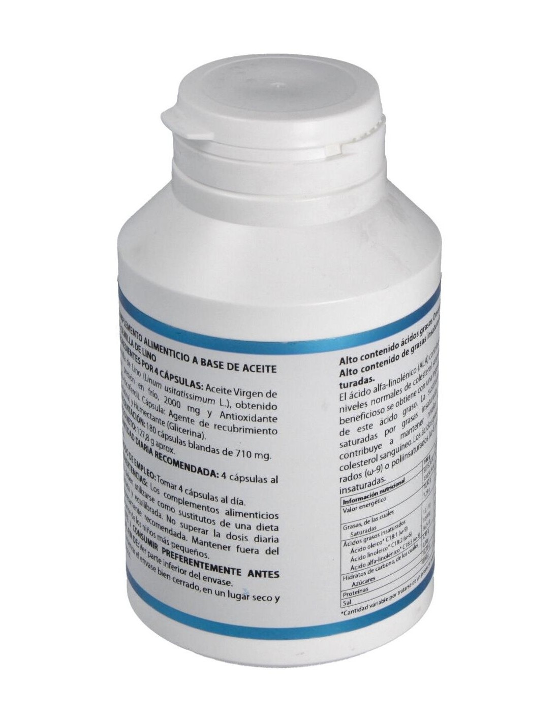 Aceite de Lino y Vitamina E. Envoltura vegetal, Gelatina, Glicerina.