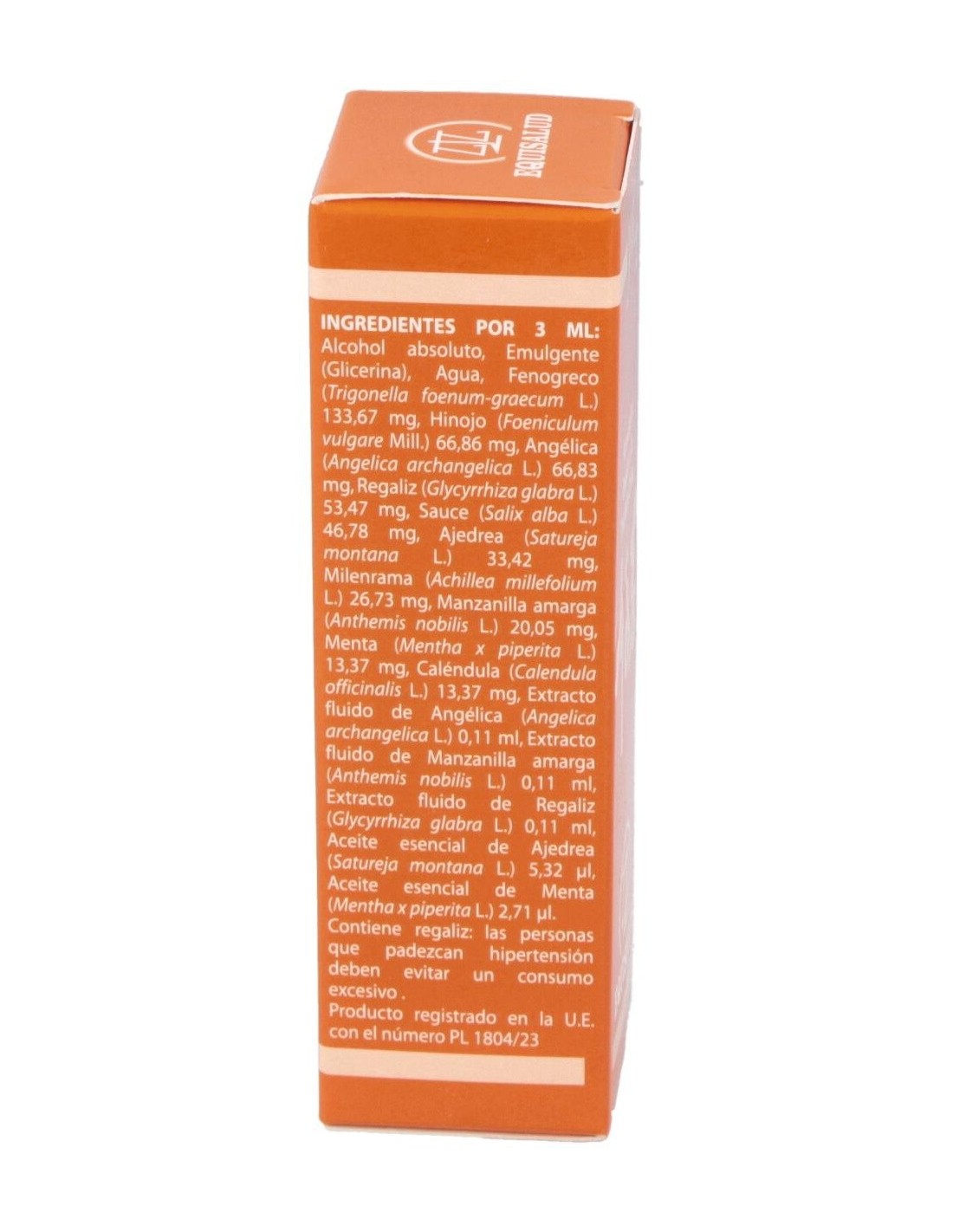 Este síndrome tiene su origen en errores alimenticios por irregularidad en cantidad y horarios, y por alimentación demasiado rica en grasas, azúcar, alcohol, tabaco y picantes. También el abuso de crudos y fríos debilitan progresivamente la energía de bazo y estómago. Exceso de estrés (congestión de las siete pasiones), preocupaciones y enfermedades de tipo frío SANG HAN aprovechan la agresión al estómago para herir al bazo. Manifestaciones asociadas a este síndrome: La disarmonía de bazo-estómago dificulta las funciones de absorción y transporte pudiendo aparecer anorexia si el cuadro está muy avanzado, hinchazón postprandial, sensación de plenitud epigástrica y heces blandas y mal formadas. Este vacío engendra insuficiencia de energía y de sangre y por tanto los músculos de los 4 miembros no están bien alimentados. Así daría lugar a signos de vacío de sangre y energía, bulimia a pesar de la indigestión. Esta falta de energía y de sangre se traduce en inconsistencia del tejido conjuntivo, con ptosis muscular de riñón, de útero. En la desarmonía de bazo-estómago se producen hemorragias pero hay que aclarar que no son todas las úlceras sino las propias de este síndrome. Composición:Ajedrea (Satureja montana), Angélica (Angelica archangelica), Caléndula (Calendula officinalis), Fenogreco (Trigonella foenum-graecum), Hinojo (Foeniculum vulgare), Manzanilla Amarga (Anthemis nobilis), Menta (Mentha x piperita), Milenrama (Achillea millefolium), Regaliz (Glycyrrhiza glabra), Sauce (Salix alba). Modo de empleo:Tomar de 20 a 30 gotas disueltas en medio vaso de agua, 3 veces al día. Presentación:Frasco de 31 ml.