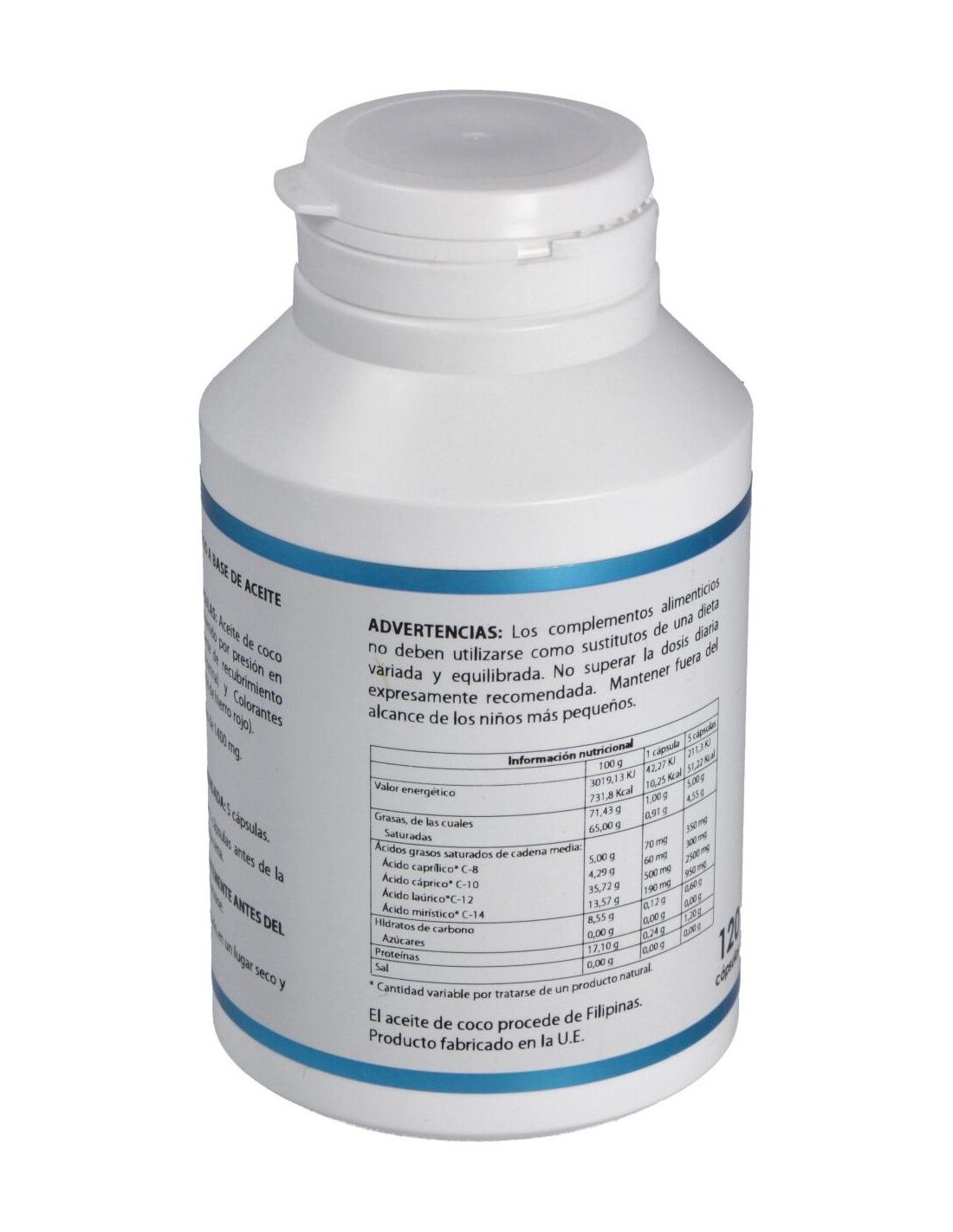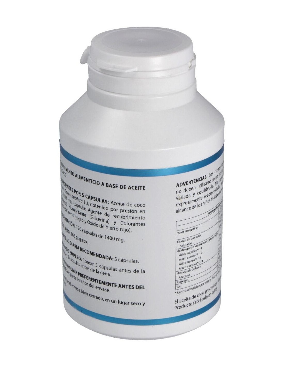El aceite de coco también tiene otras interesantes propiedades: es un protector cardíaco, estimula ligeramente el tiroides y ayuda a tener controlado el colesterol y los triglicéridos. Composición por perla:1.000 mg de aceite de coco virgen y orgánico. Modo de empleo:Tomar 5 perlas al día, 3 antes de comer y 2 antes de cenar. Presentación:Bote de 120 perlas.