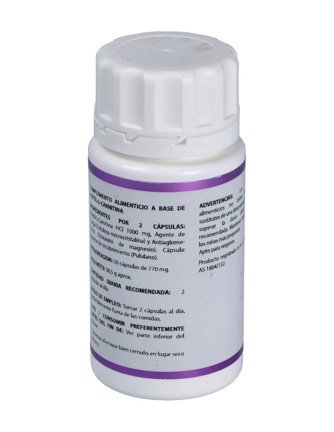 Composición por cápsula:500 mg de Acetil L-Carnitina (HCl).Modo de empleo:Tomar 2 cápsulas al día fuera de las comidas.Presentación:Bote de 50 cápsulas.