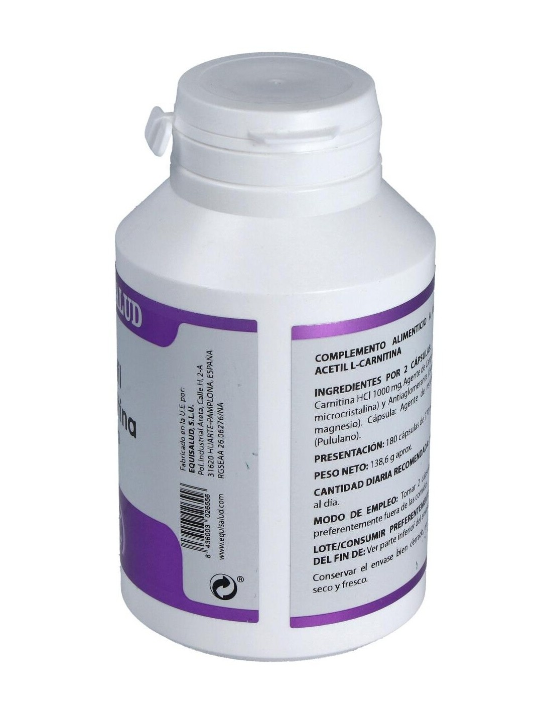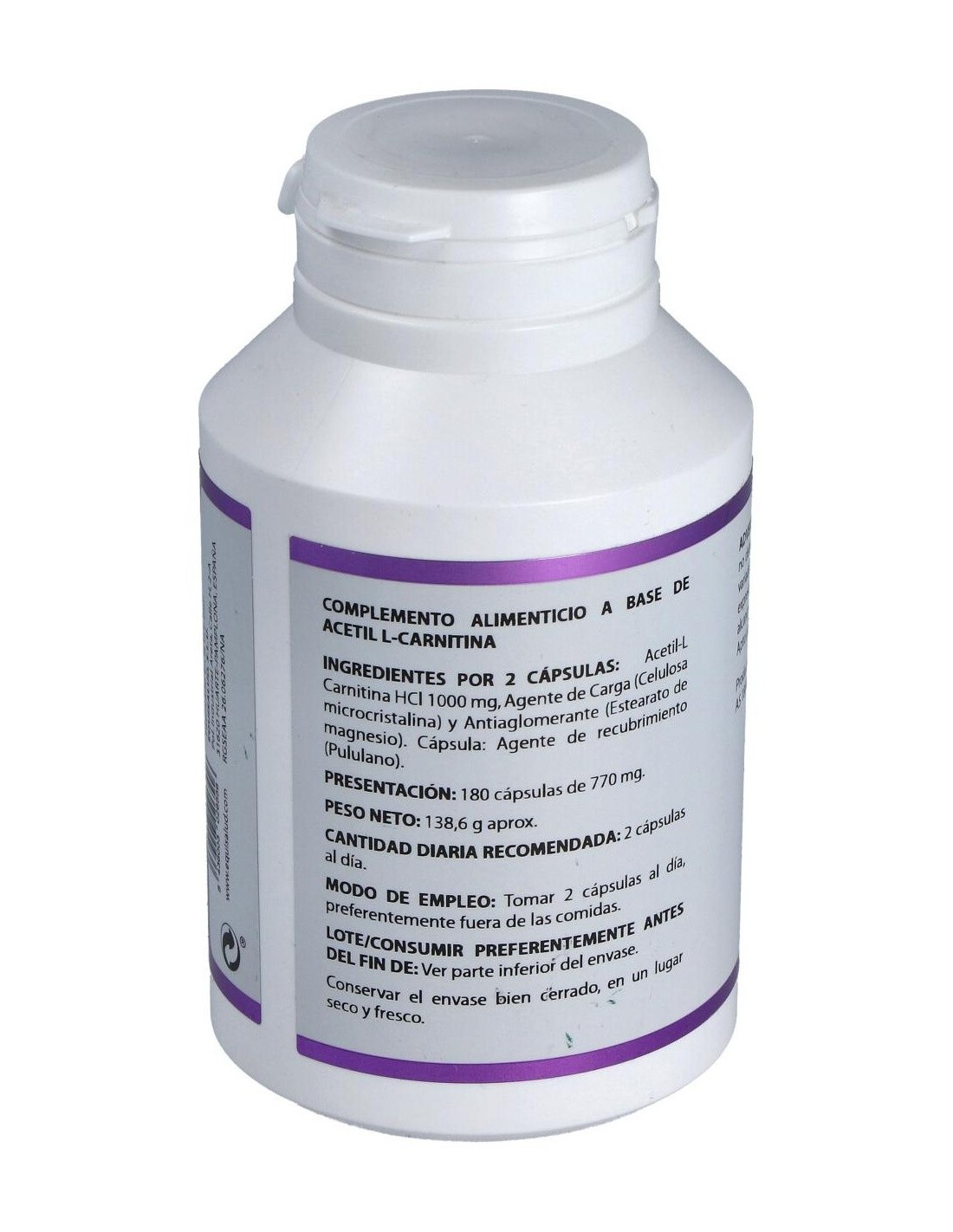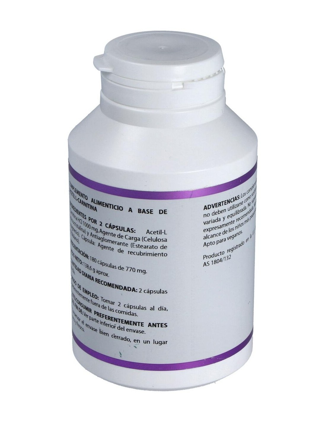Composición por cápsula:500 mg de Acetil L-Carnitina (HCl). Modo de empleo:Tomar 2 cápsulas al día fuera de las comidas. Presentación:Bote de 180 cápsulas.