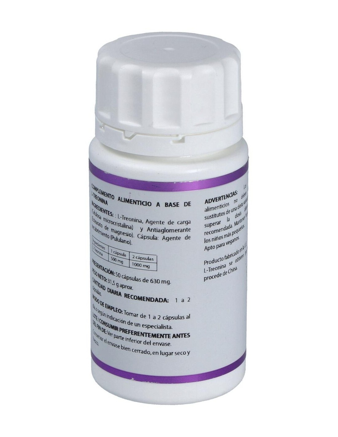 Composición por cápsula: L-treonina*, 500 mg. Envoltura: polisacárido de origen vegetal (pululano). No contiene gluten, ni almidón, ni transgénicos, ni colorantes. Apta para vegetarianos, diabéticos y pacientes con dietas restrictivas. * L-treonina obtenida por fermentación. País de origen: China.
