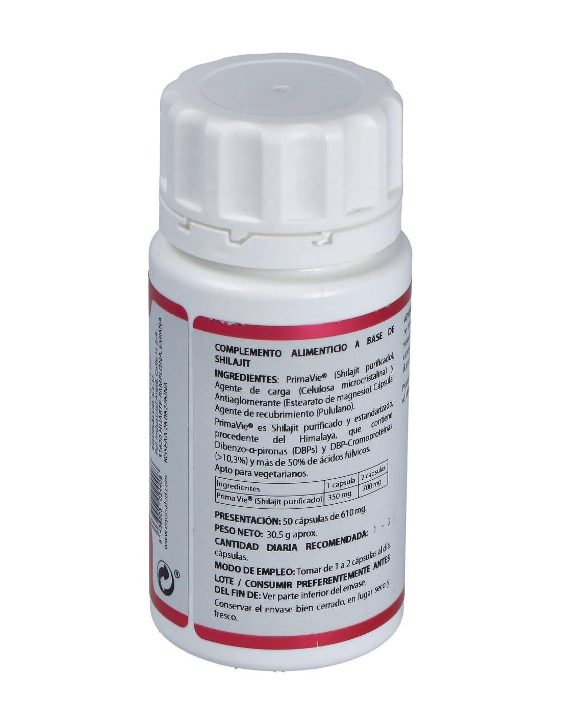 Ingredientes activos por cápsula:250 mg PrimaVie® (Shilajit purificado).Modo de empleo:Tomar de 1 a 2 cápsulas al día.Presentación:Bote de 50 cápsulas.