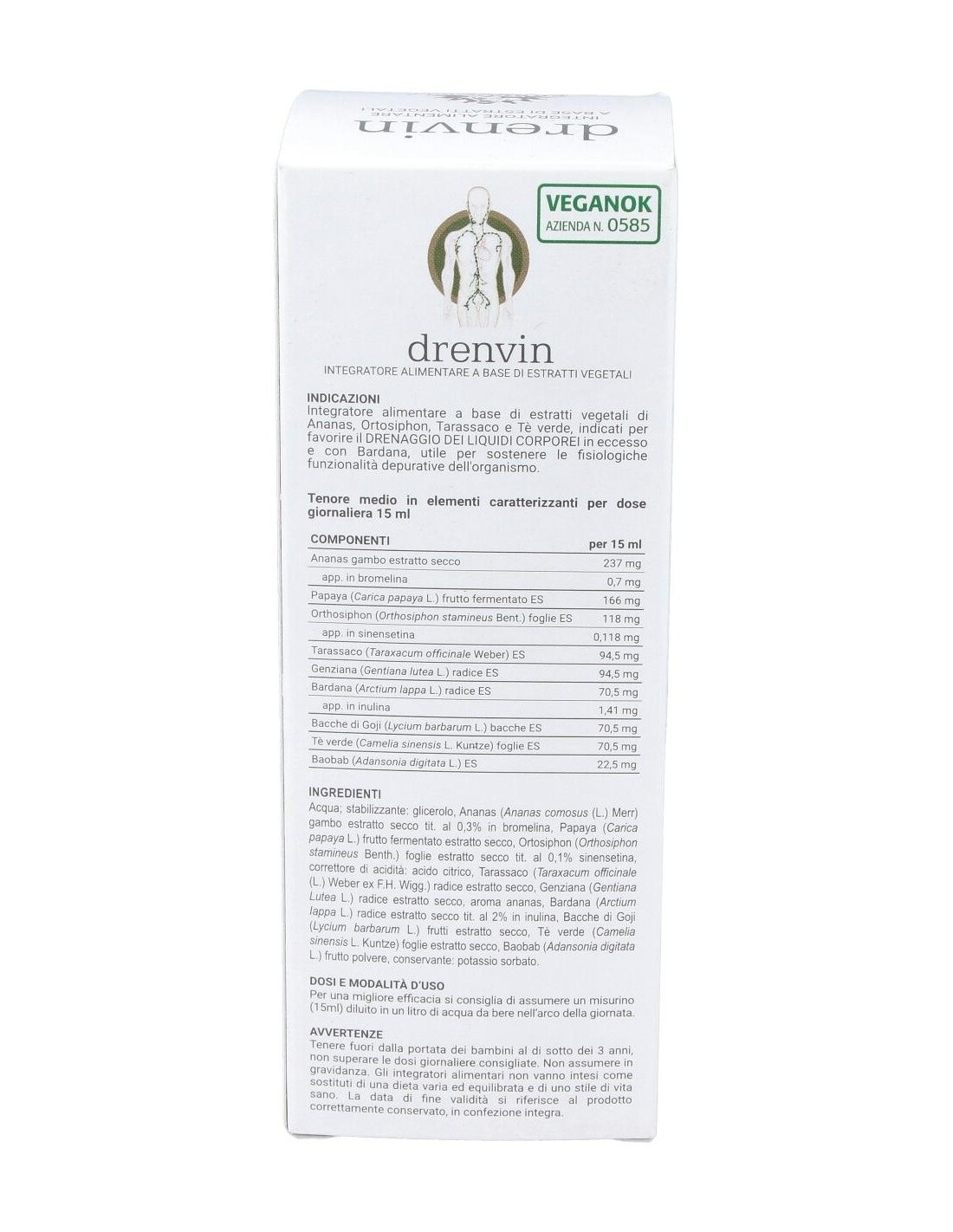 Agua: estabilizador: glicerina vegetal: Piña (Ananas comosus (L.) Merr) tallo extracto seco tit. al 0,3% en bromelina, Papaya (Carica papaya L.) fruto fermentado extracto seco, Ortosiphon (Ortosifón stamineus Benth.) hojas extracto seco tit. al 0,1 sinensetina, Diente de león (Taraxacum officinale Weber) raíz extracto seco, Genciana (Gentiana lutea L.) raíz extracto seco, aroma piña, Bardana (Arctium lappa L.) raíz extracto seco tit. 2% en inulina, Bayas de Goji (Lycium barbarum L.) frutos extracto seco, Té verde (Camellia sinensis L. Kuntze) hojas extracto seco, Baobab (Adansonia digitata L.) fruto extracto seco, conservante: sorbato de potasio.