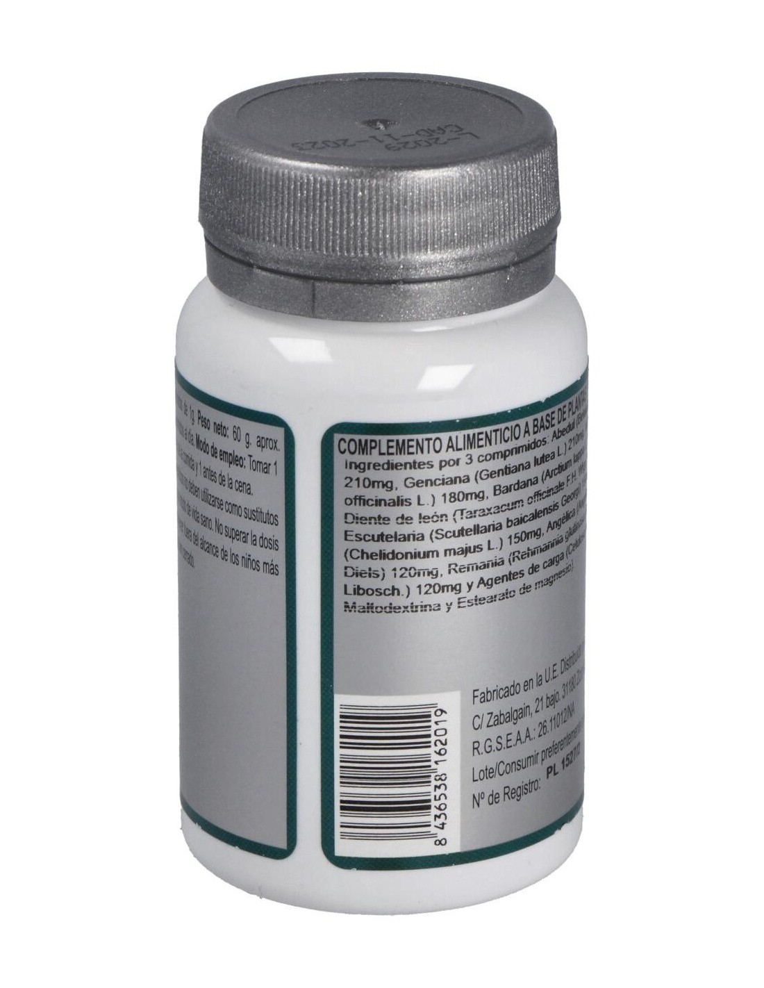 Abedul (Betula alba L.) 210 mg, Genciana (Gentiana lutea L.) 210 mg, Melisa (Melissa officinalis L.) 180 mg, Bardana (Arctium lappa L.) 180 mg, Diente de león (Taraxacum officinale F.H. Wigg.) 180 mg, Escutelaria (Scutellaria baicalensis Georgi) 150 mg, Celidonia (Chelidonium majus L.) 150 mg, Angélica (Angelica sinensis Diels) 120 mg, Remania (Rehmannia glutinosa (Gaertn.) Libosch.) 120 mg y Agentes de carga (Celulosa microcristalina, Maltodextrina y Estearato de magnesio).