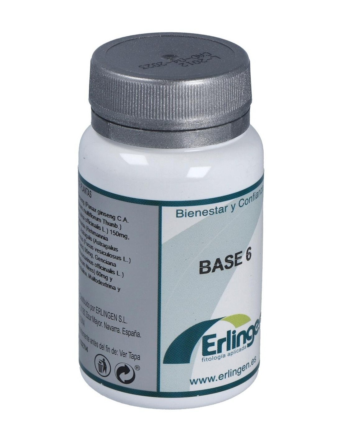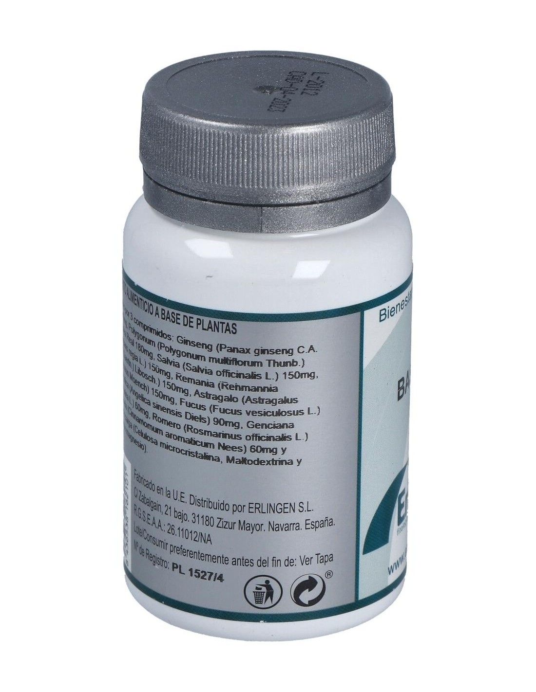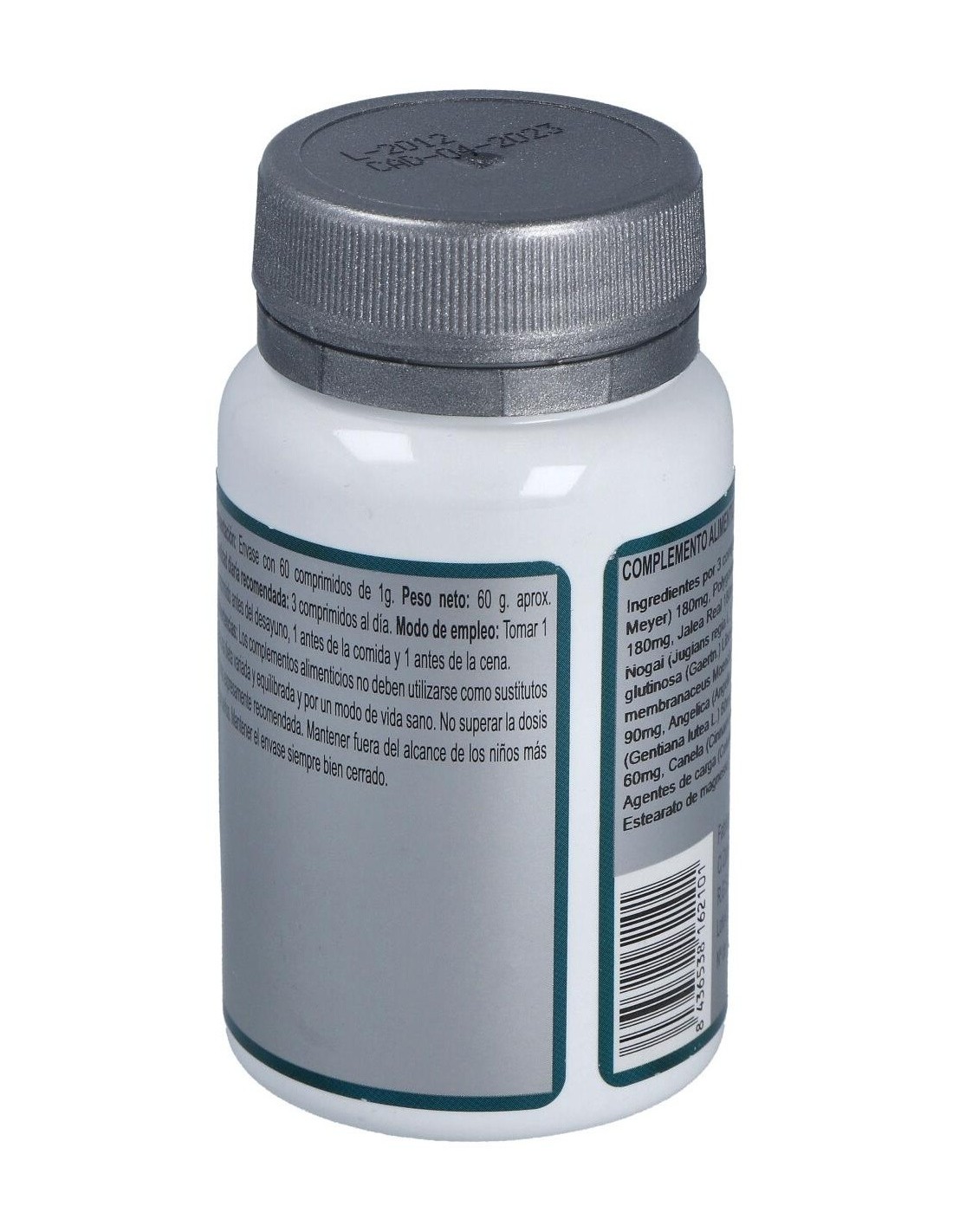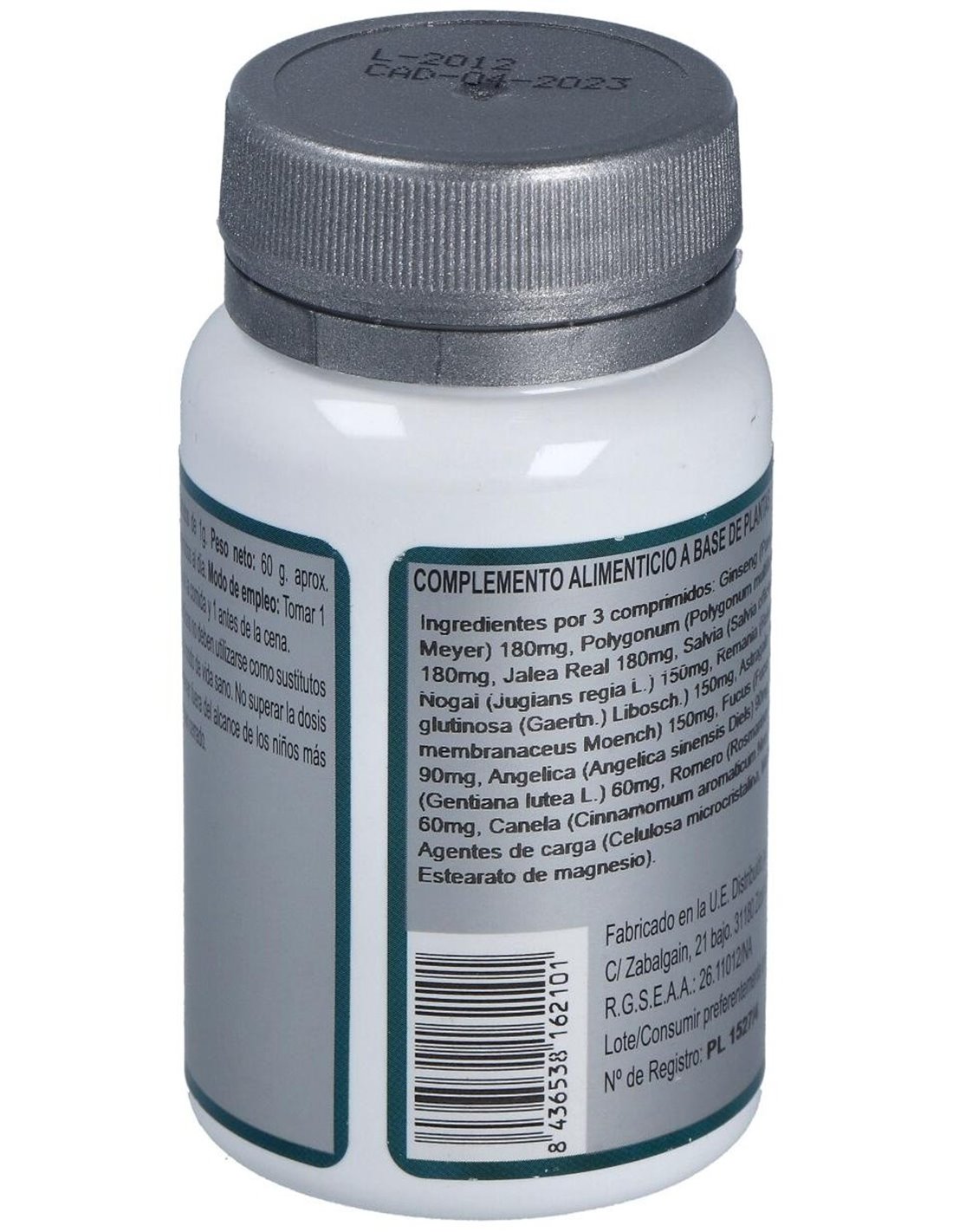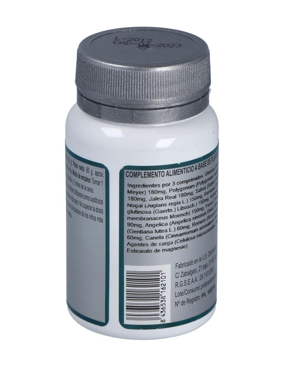 Ginseng (Panax ginseng C.A. Meyer) 180 mg, Polygonum (Polygonum multiflorum Thunb.) 180 mg, Jalea Real 180 mg, Salvia (Salvia officinalis L.) 150 mg, Nogal (Juglans regia L.) 150 mg, Remania (Rehmannia glutinosa (Gaertn.) Libosch.) 150 mg, Astrágalo (Astragalus membranaceus Moench) 150 mg, Fucus (Fucus vesiculosus L.) 90 mg, Angélica (Angelica sinensis Diels) 90 mg, Genciana (Gentiana lutea L.) 60 mg, Romero (Rosmarinus officinalis L.) 60 mg, Canela (Cinnamomum aromaticum Nees) 60 mg y Agentes de carga (Celulosa microcristalina, Maltodextrina y Estearato de magnesio).
