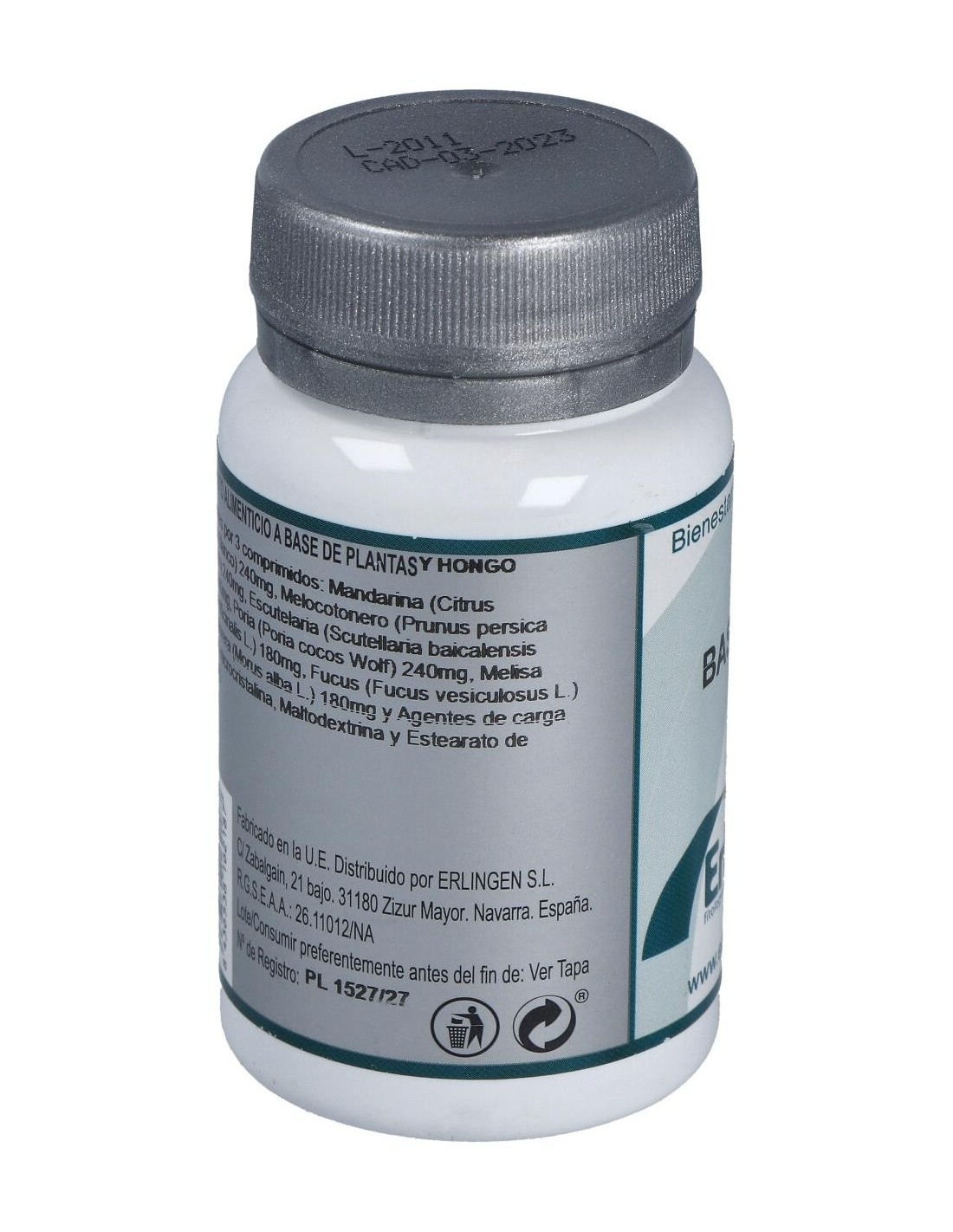 Mandarina (Citrus reticulata Blanco) 240 mg, Melocotonero (Prunus persica (L.) Batsch) 240 mg, Escutelaria (Scutellaria baicalensis Georgi) 240 mg, Poria (Poria cocos Wolf) 240 mg, Melisa (Melissa officinalis L.) 180 mg, Fucus (Fucus vesiculosus L.) 180 mg, Morera (Morus alba L.) 180 mg y Agentes de carga (Celulosa microcristalina, Maltodextrina y Estearato de magnesio).