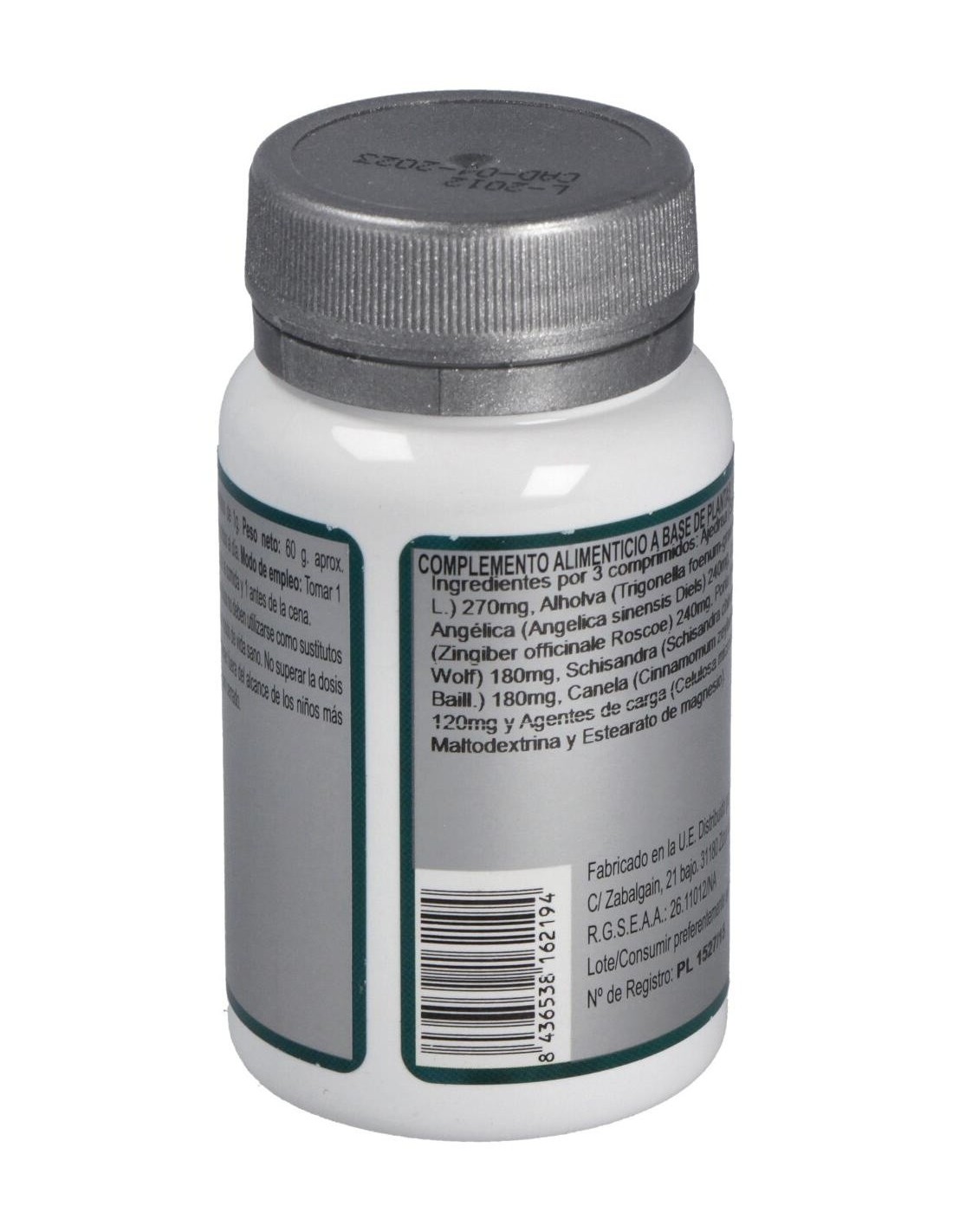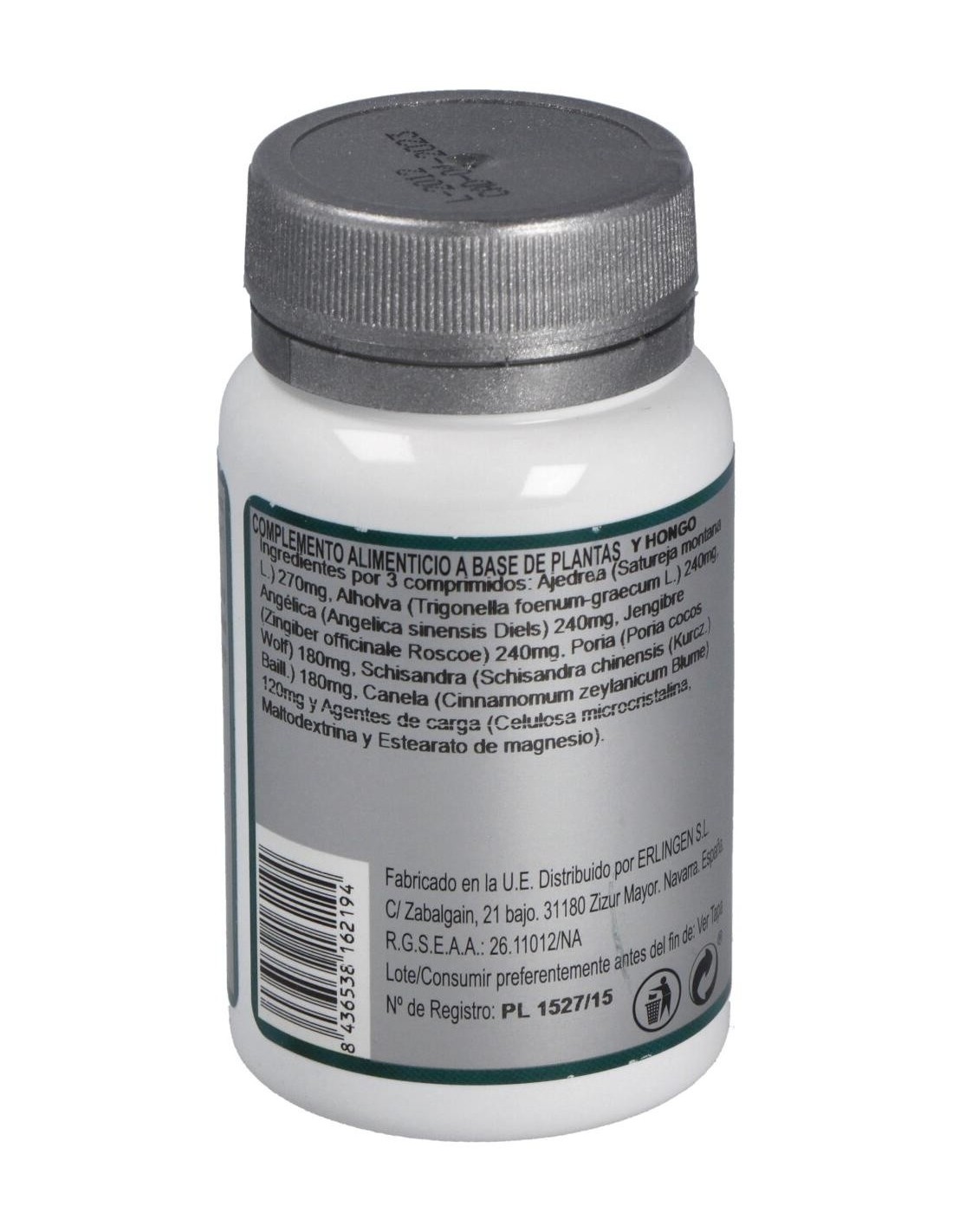 Ajedrea (Satureja montana L.) 270 mg, Alholva (Trigonella foenum-graecum L.) 240mg, Angélica (Angelica sinensis Diels) 240 mg, Jengibre (Zingiber officinale Roscoe) 240 mg, Poria (Poria cocos Wolf) 180 mg, Schisandra (Schisandra chinensis (Kurcz.) Baill.) 180 mg, Canela (Cinnamomum zeylanicum Blume) 120 mg y Agentes de carga (Celulosa microcristalina, Maltodextrina y Estearato de magnesio).