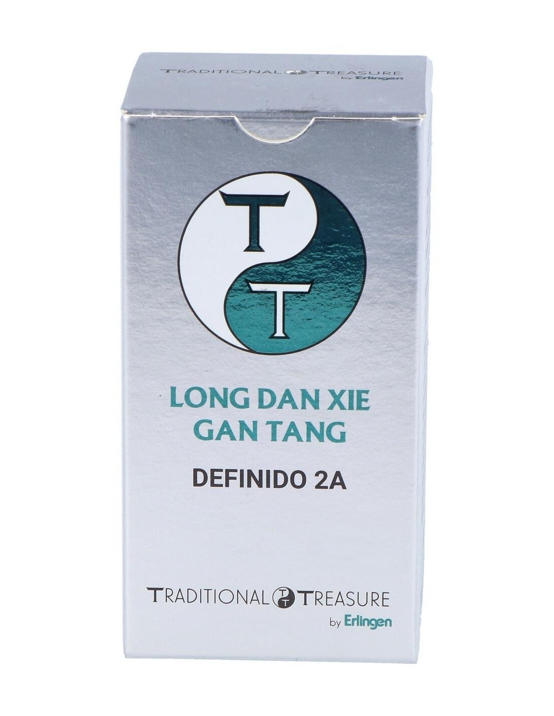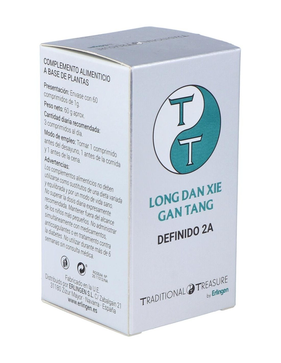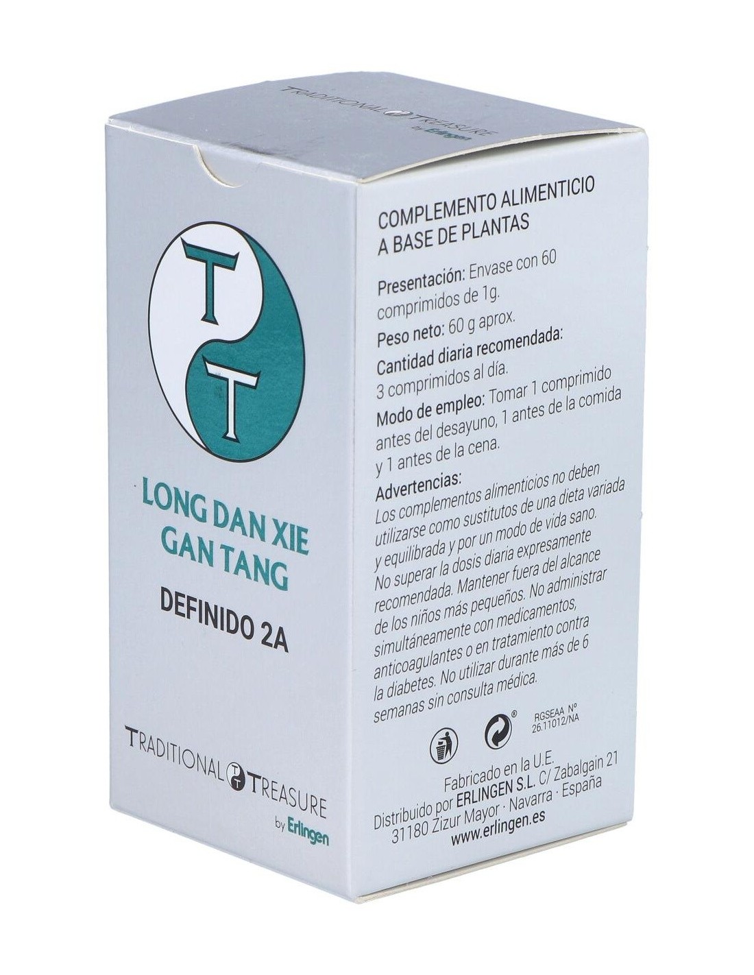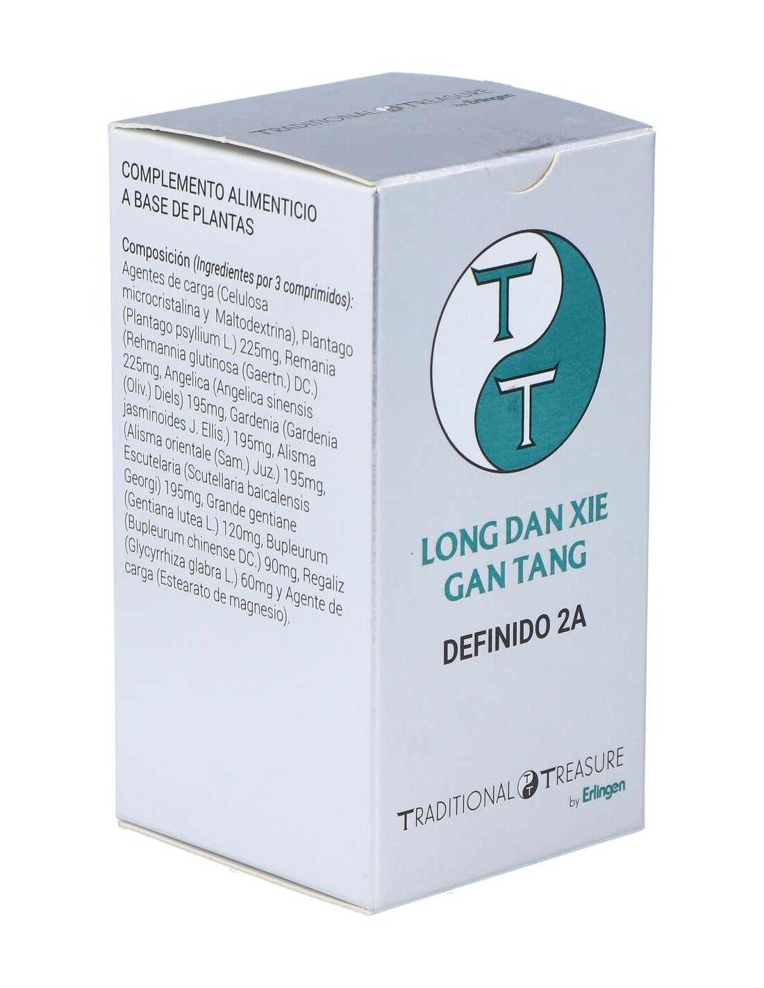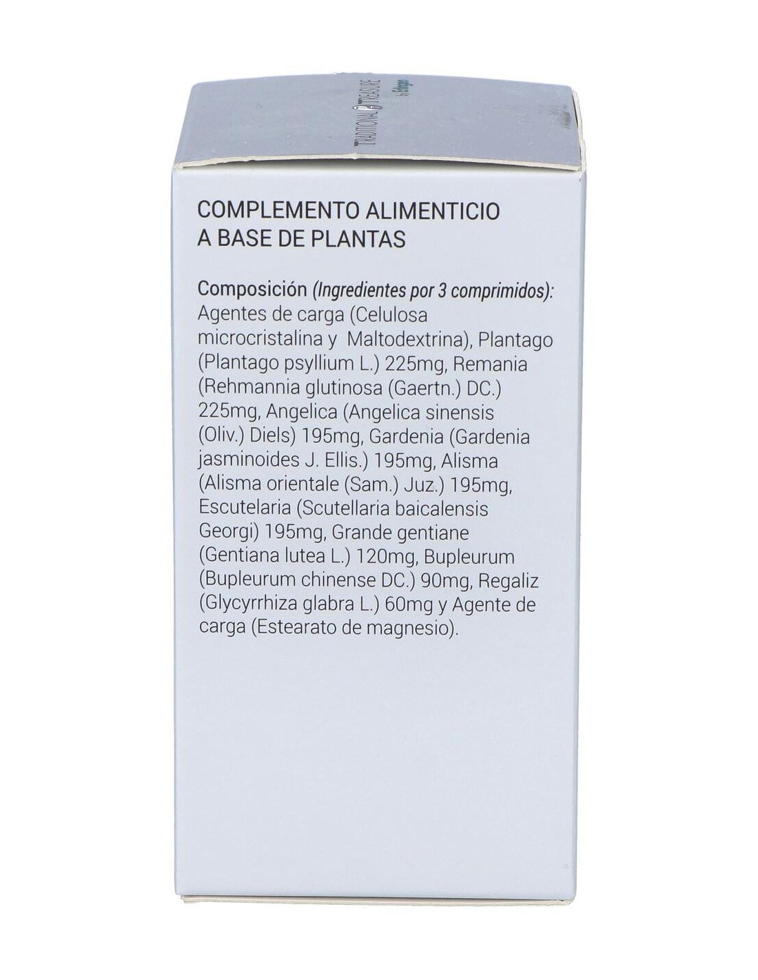 Agentes de carga (Celulosa microcristalina y Maltodextrina), Plantago (Plantago psyllium L.) 225 mg, Remania (Rehmannia glutinosa (Gaertn.) DC.) 225 mg, Angelica (Angelica sinensis (Oliv.) Diels) 195 mg, Gardenia (Gardenia jasminoides J. Ellis.) 195 mg, Alisma (Alisma orientale (Sam.) Juz.) 195 mg, Escutelaria (Scutellaria baicalensis Georgi) 195 mg, Genciana (Gentiana lutea L.) 120 mg, Bupleurum (Bupleurum chinense DC.) 90 mg, Regaliz (Glycyrrhiza glabra L.) 60 mg y Agente de carga (Estearato de magnesio).