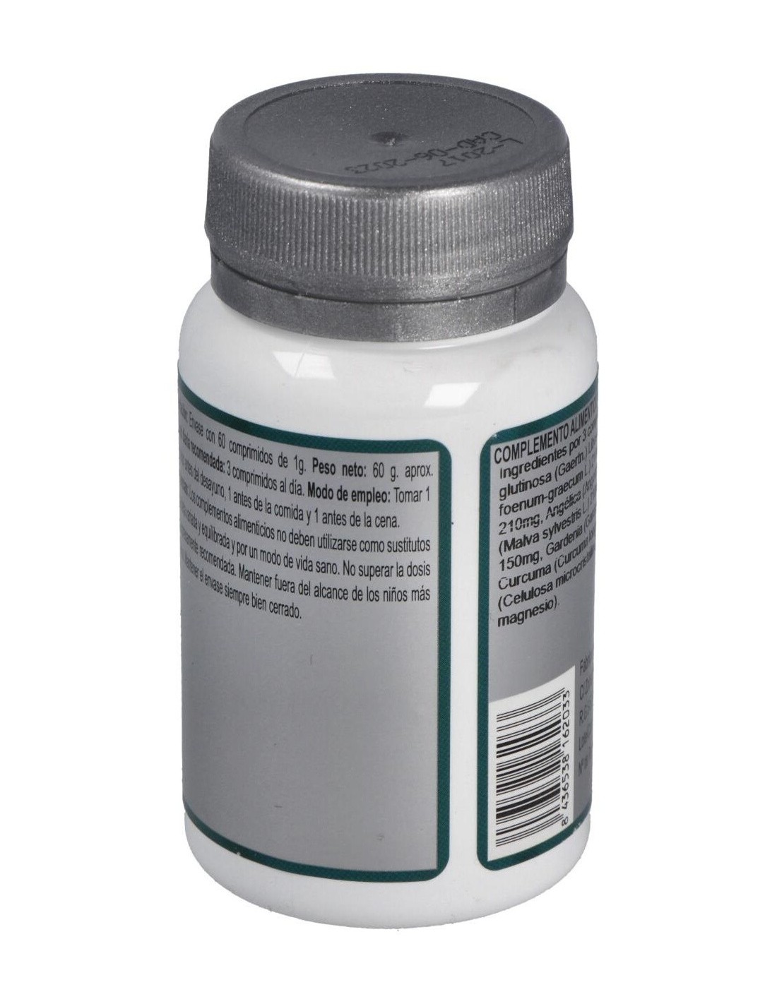 Remania (Rehmannia glutinosa (Gaertn.) Libosch.) 270 mg, Alholva (Trigonella foenum-graecum L.) 210 mg, Melisa (Melissa officinalis L.) 210 mg, Angélica (Angelica sinensis Diels) 210 mg, Malva (Malva sylvestris L.) 210 mg, Genciana (Gentiana lutea L.) 150 mg, Gardenia (Gardenia jasminoides J. Ellis) 120 mg, Cúrcuma (Curcuma longa L.) 120 mg y Agentes de carga (Celulosa microcristalina, Maltodextrina y Estearato de magnesio).