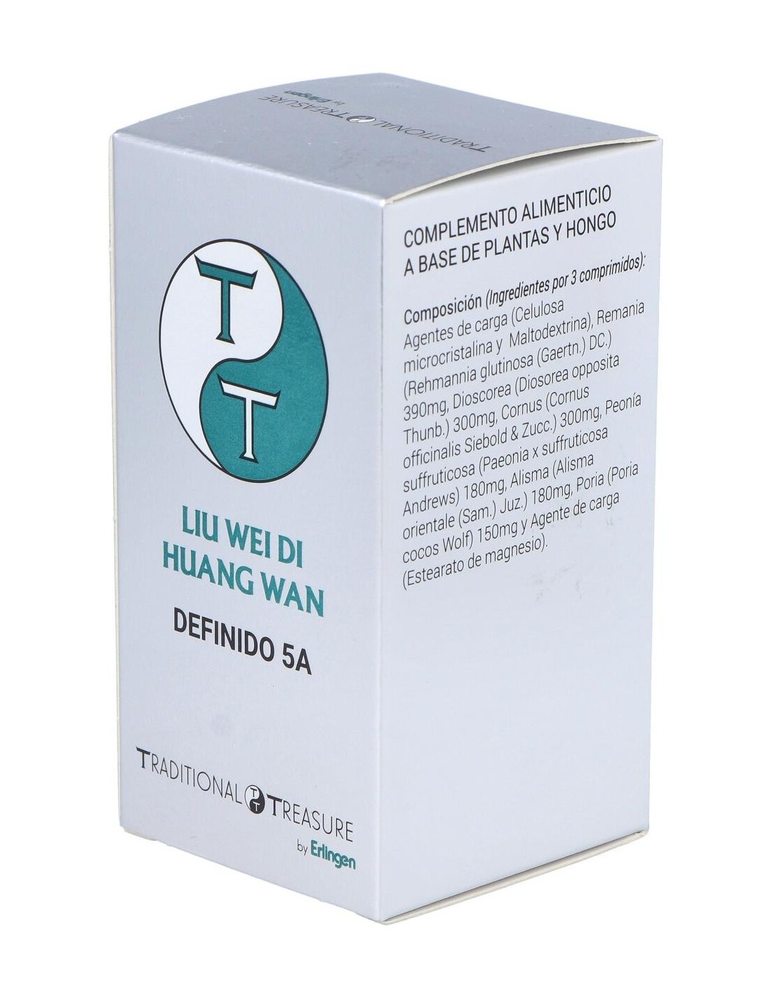 Agentes de carga (Celulosa microcristalina y Maltodextrina), Remania (Rehmannia glutinosa (Gaertn.) DC.) 390 mg, Dioscorea (Diosorea opposita Thunb.) 300 mg, Cornus (Cornus officinalis Siebold & Zucc.) 300 mg, Peonía suffruticosa (Paeonia x suffruticosa Andrews) 180 mg, Alisma (Alisma orientale (Sam.) Juz.) 180 mg, Poria (Poria cocos Wolf) 150 mg y Agente de carga (Estearato de magnesio).