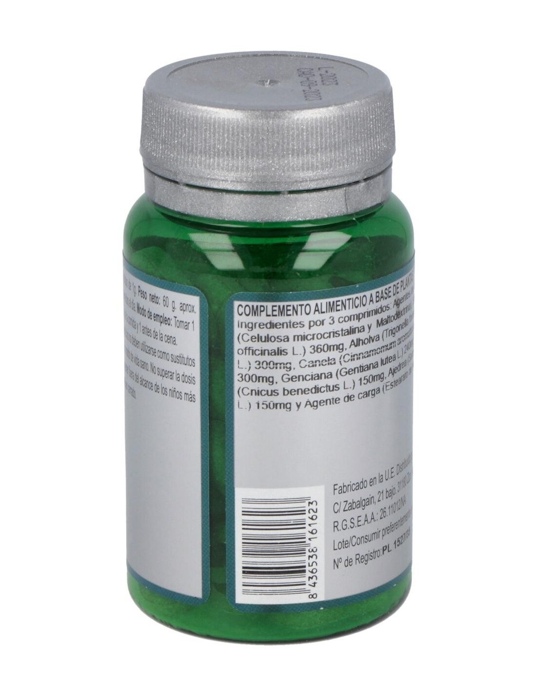 Ingredientes por 3 comprimidos: Agentes de carga (Celulosa microcristalina y Maltodextrina), Salvia (Salvia officinalis L.) 360mg, Alholva (Trigonella foenum-graecum L.) 300mg, Canela (Cinnamomum aromaticum Nees) 300mg, Genciana (Gentiana lutea L.) 240mg, Cardo Santo (Cnicus benedictus L.) 150mg, Ajedrea (Satureja montana L.) 150mg y Agente de carga (Estearato de magnesio).