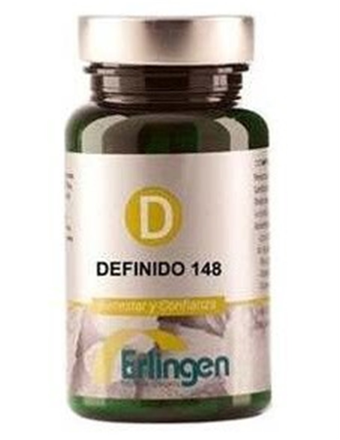 Erlingen Definido nº148, complemento alimenticio elaborado a base de angélica (Angelica sinensis Diels), Bupleurum (Bupleurum chinense DC.), Peonia (Paeonia lactiflora Pall.), Atractilodes (Atractylodes macrocephala Koidz.), Poria (Poria cocos Wolf), Ginseng (Panax ginseng C.A. Meyer) y Agentes de carga (Celulosa microcristalina, Maltodextrina y Estearato de magnesio).