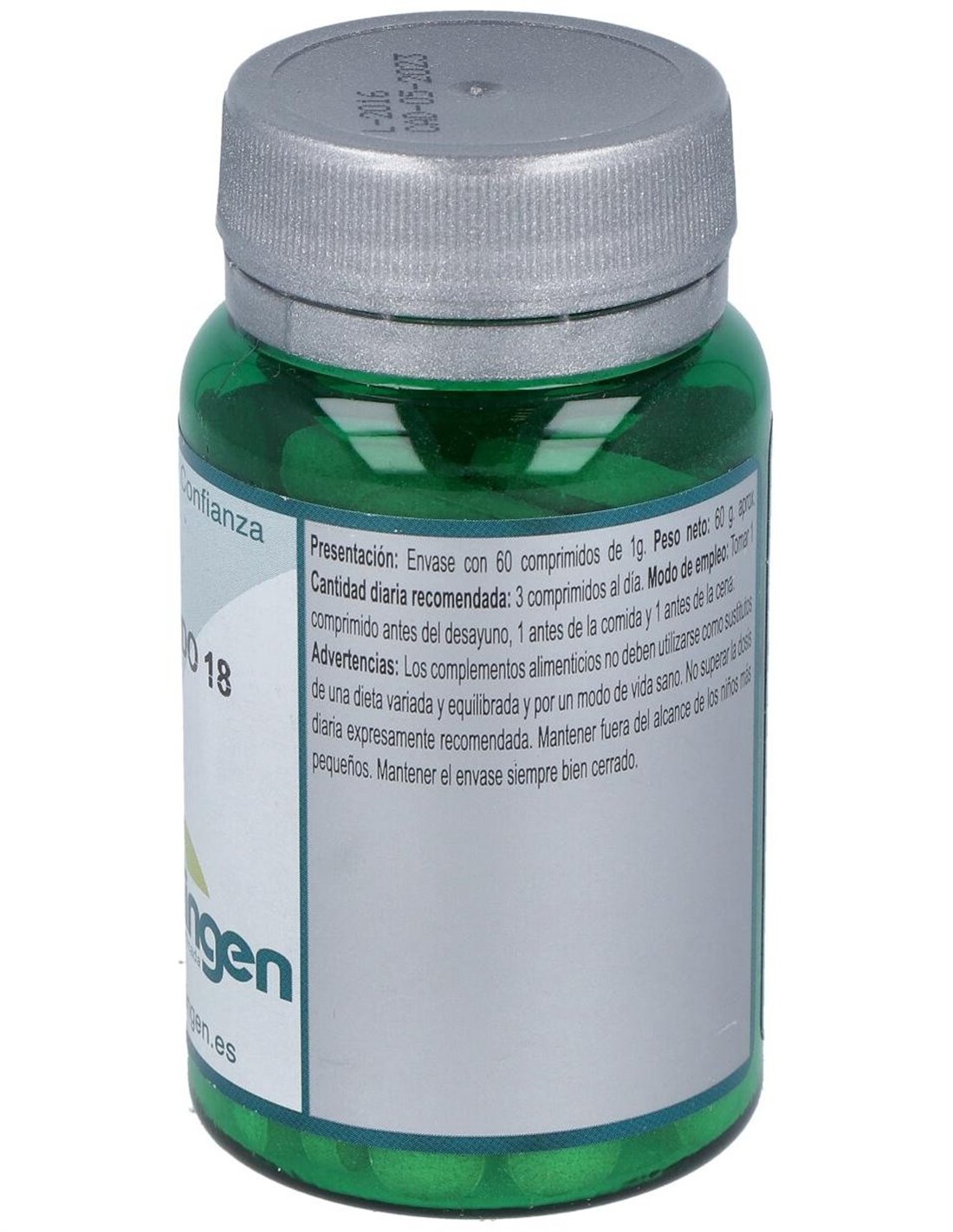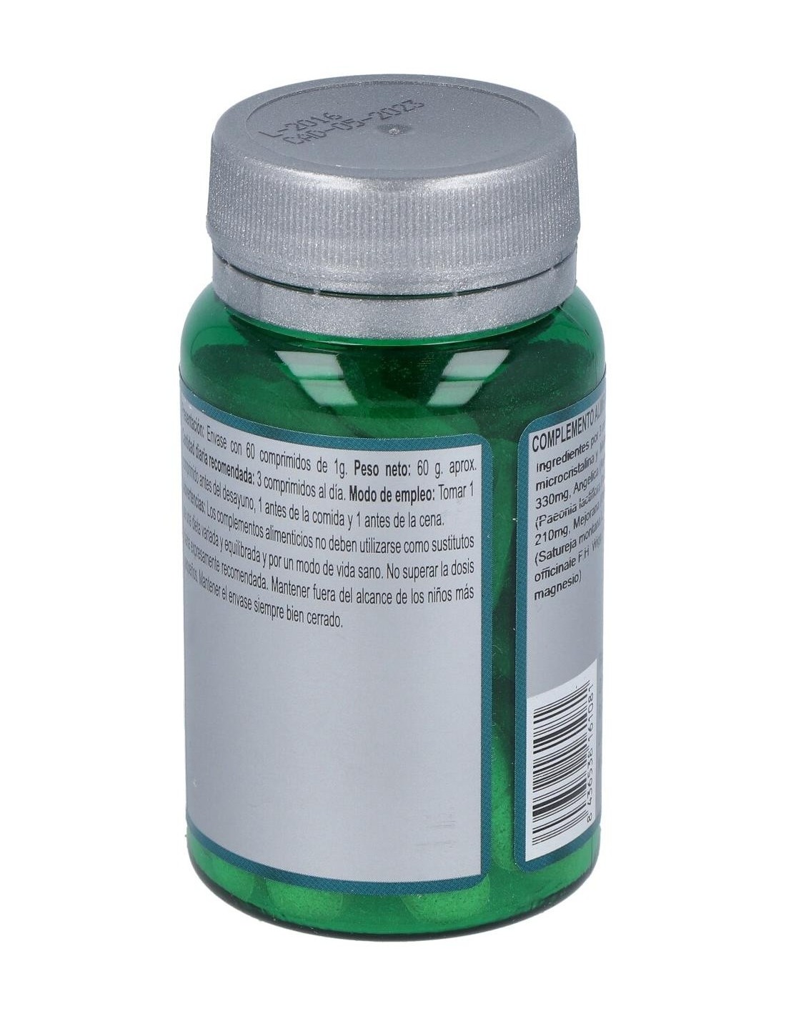 Agentes de carga (Celulosa microcristalina y Maltodextrina), Tomillo (Thymus vulgaris L.) 330 mg, Angélica (Angelica sinensis Diels) 270 mg, Peonía (Paeonia lactiflora Pall.) 255 mg, Menta (Mentha x piperita L.) 210 mg, Mejorana (Origanum majorana L.) 165 mg, Ajedrea (Satureja montana L.) 150 mg, Diente de león (Taraxacum officinale F.H. Wigg.) 120 mg y Agente de carga (Estearato de magnesio).