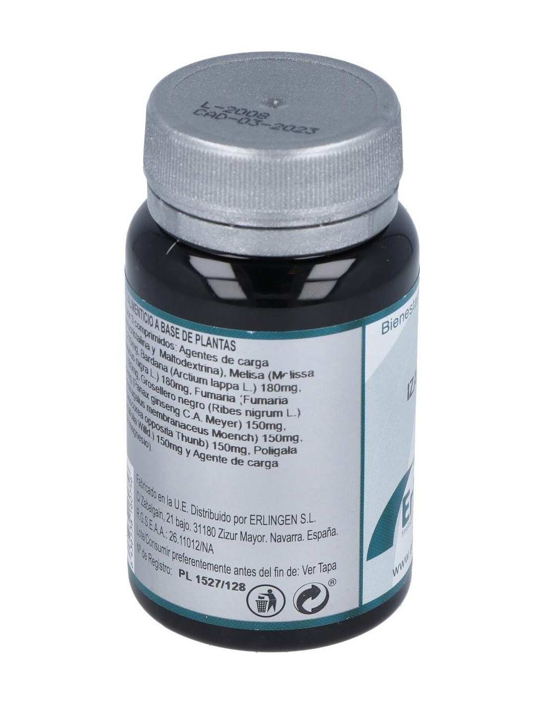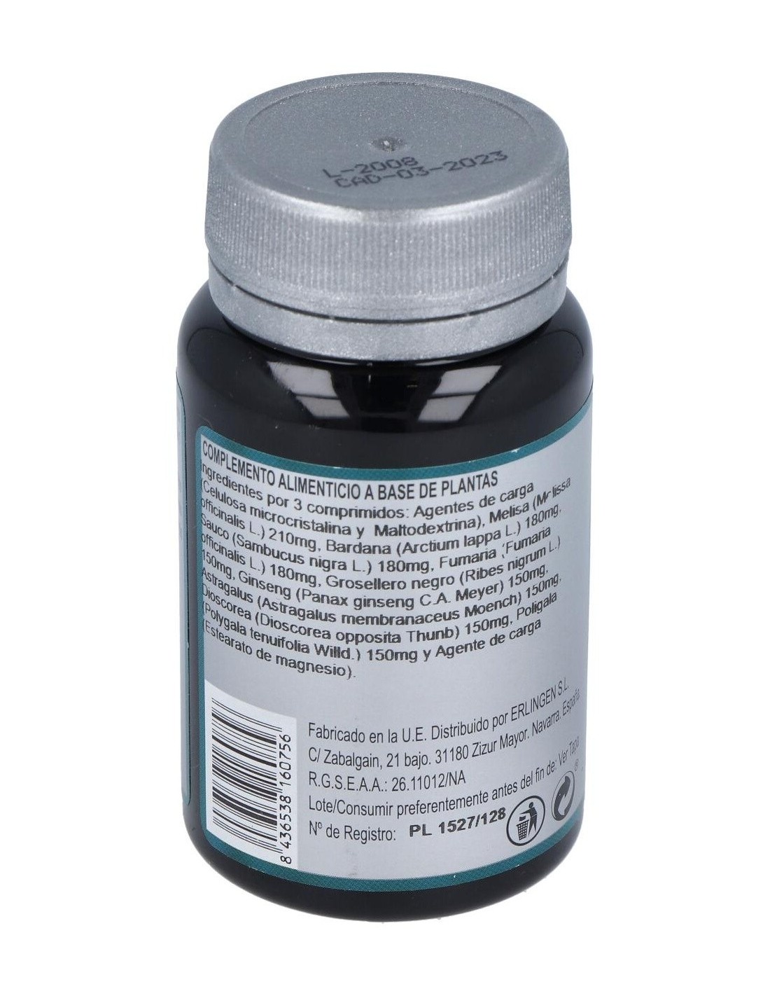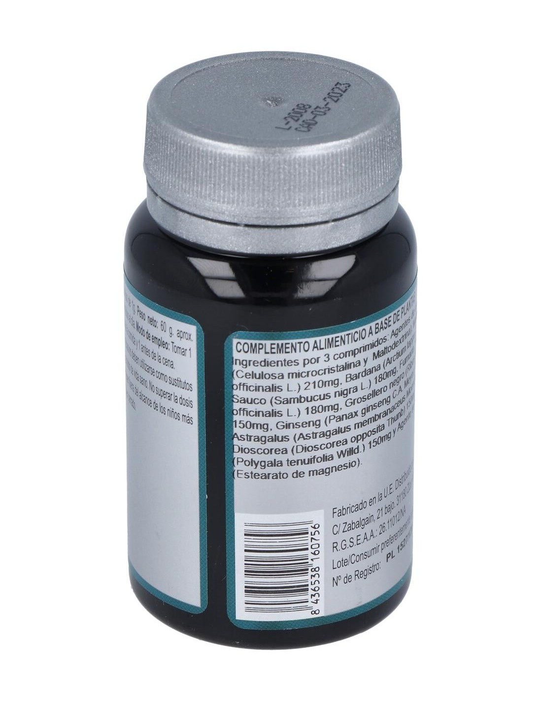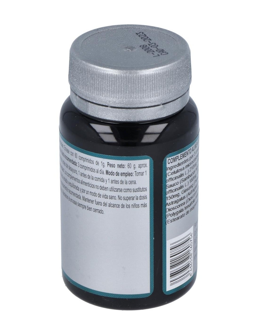 Agentes de carga (Celulosa microcristalina y Maltodextrina), Melisa (Melissa officinalis L.) 210 mg, Bardana (Arctium lappa L.) 180 mg, Saúco (Sambucus nigra L.) 180 mg, Fumaria (Fumaria officinalis L.) 180 mg, Grosellero negro (Ribes nigrum L.) 150 mg, Ginseng (Panax ginseng C.A. Meyer) 150 mg, Astragalus (Astragalus membranaceus Moench) 150 mg, Dioscorea (Dioscorea opposita Thunb) 150 mg, Poligala (Polygala tenuifolia Willd.) 150 mg y Agente de carga (Estearato de magnesio).