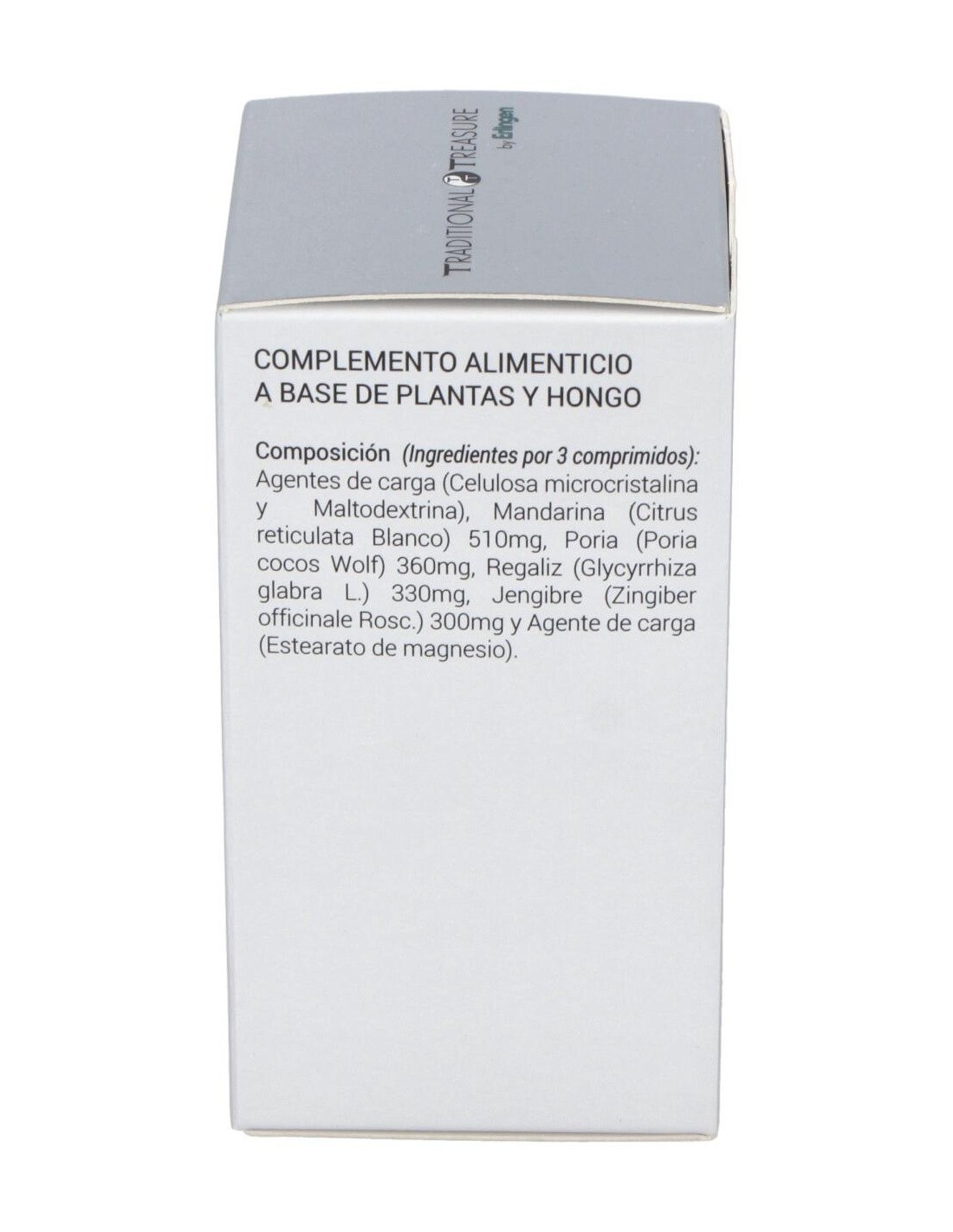 Agentes de carga (Celulosa microcristalina y Maltodextrina), Mandarina (Citrus reticulata Blanco) 510 mg, Poria (Poria cocos Wolf) 360 mg, Regaliz (Glycyrrhiza glabra L.) 330 mg, Jengibre (Zingiber officinale Rosc.) 300 mg y Agente de carga (Estearato de magnesio).
