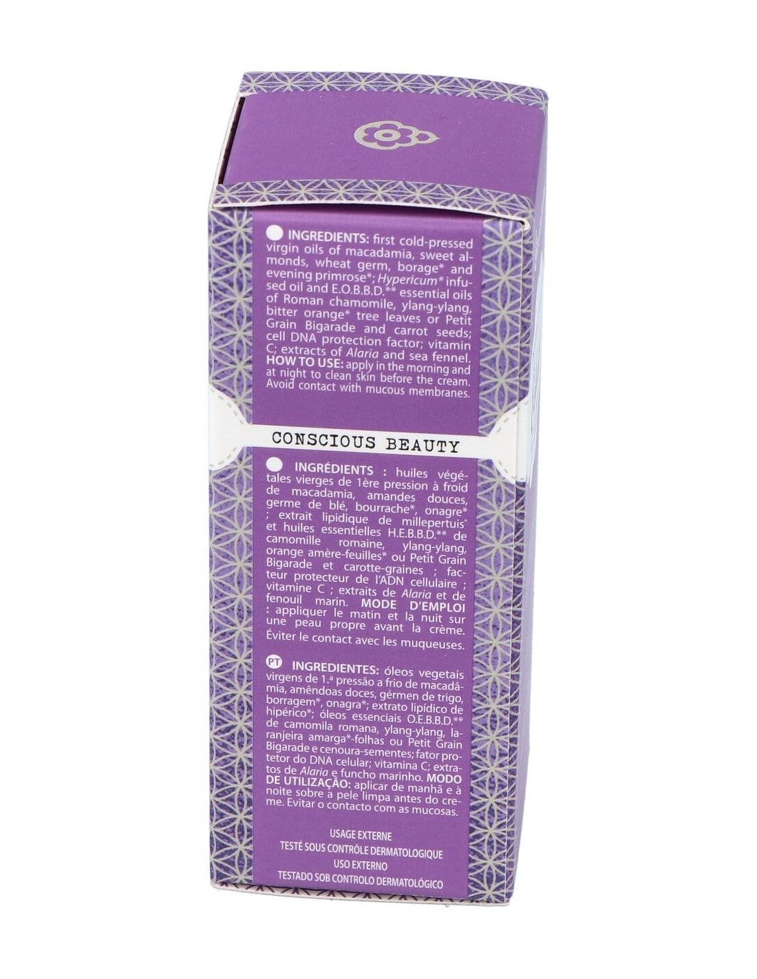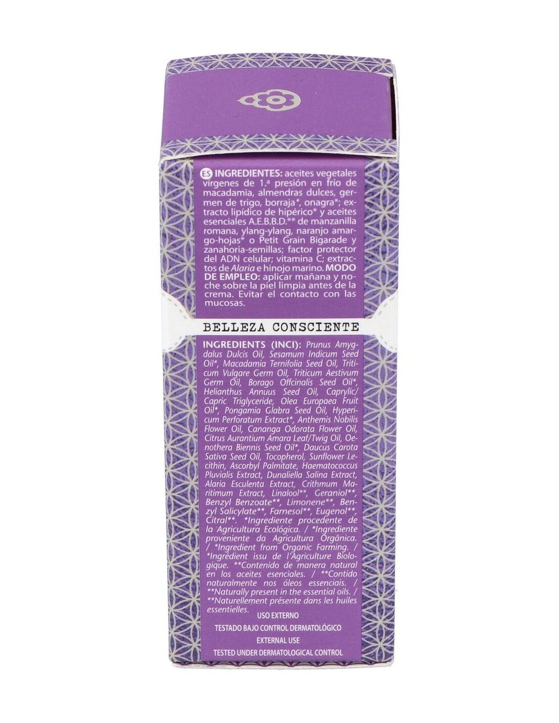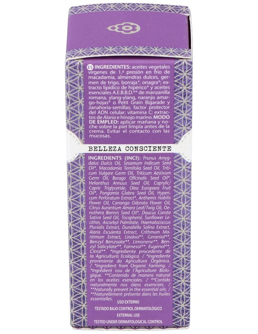 Aceites vegetales vírgenes de 1ª presión en frío de: Macadamia integrifolia, onagra, borraja, almendras: extracto lipídico de hipérico o hierba de San Juan. Aceites esenciales A.E.B.B.D.* de: naranjo-hojas, manzanilla romana, ylang-ylang y zanahoria- semillas.