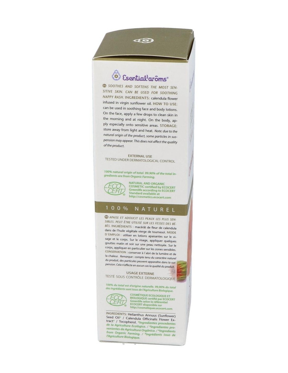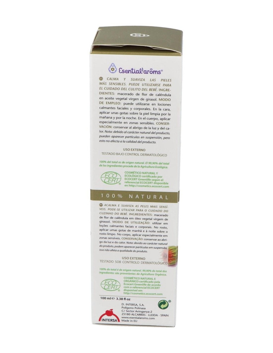 Ingredientes (INCI):Helianthus Annuus (Sunflower) Seed Oil* / Calendula Offcinalis FlowerExtract* /Tocopherol**. (*) Ingrediente procedente de la Agricultura Ecológica. (**) El tocopherol es vitamina E y es de procedencia natural.El 100% del total de los ingredientes es de origen natural. El 99.90% del total de los ingredientes procede de la Agricultura Ecológica.Modo de empleo:Puede aplicarse directamente para la hidratación corporal y para el cuidado facial de la piel irritada y sensible. En el caso del bebé puede aplicarse tras la limpieza del culito, para prevenir la aparición de irritaciones cutáneas.Presentación:Envase de 100 mlRecomendaciones y advertencias:No contiene colorantes, aromas artificiales ni productos químicos.