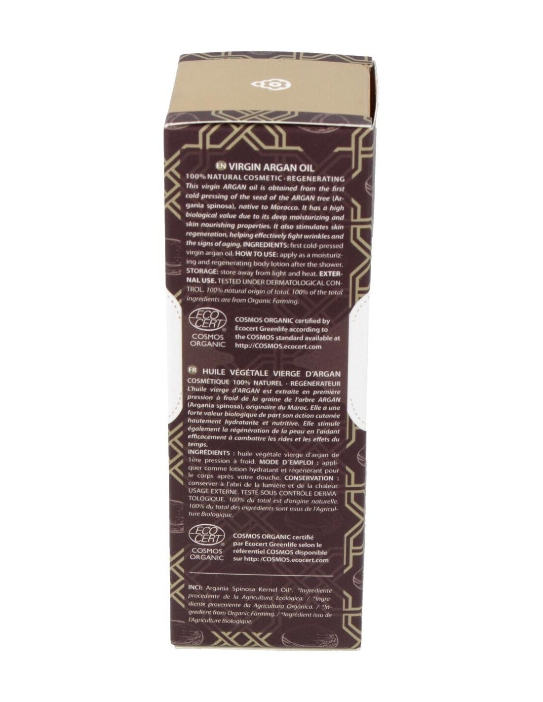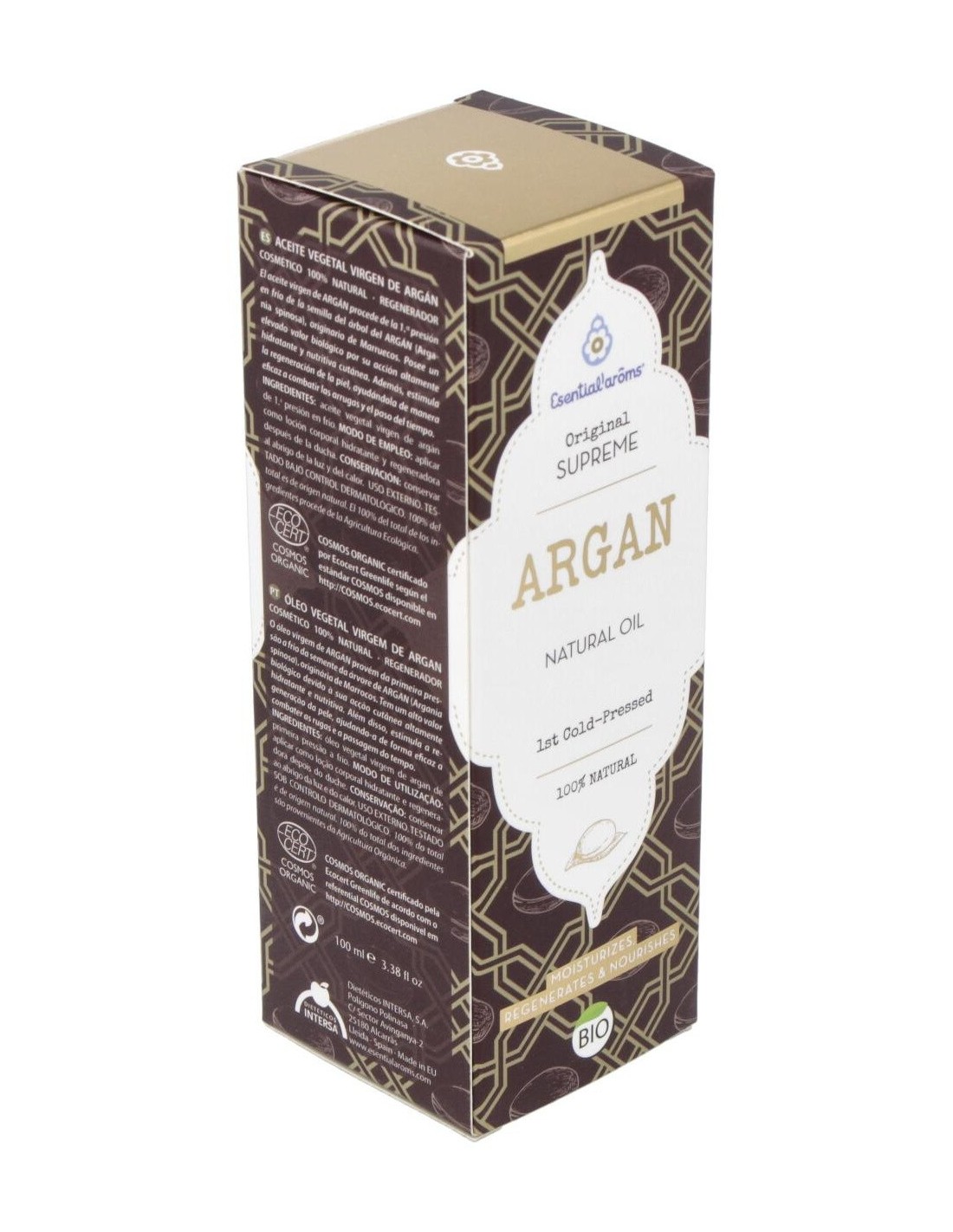 Es originario de marruecos, procedente de la agricultura ecológica, posee un elevado valor biológico, por su acción altamente hidratante y nutritiva cutánea. Además, gracias a su acción antiradicales libres y regeneradora celular, ayuda de manera eficaz a disminuir la profundidad de las arrugas y el paso del tiempo. Su elevado contenido en ácidos grasos esenciales (3 veces superior al aceite de oliva), vitamina E natural y fitoesteroles, dotan a este aceite vegetal virgen de unas propiedades únicas a nivel cosmético y dermatológico. El aceite de argán es altamente hidratante y nutritivo, regenerador celular y antioxidante. Está recomendado en cuidado especial de la piel seca, muy seca, descamada, prevención de la aparición de las arrugas del rostro.
