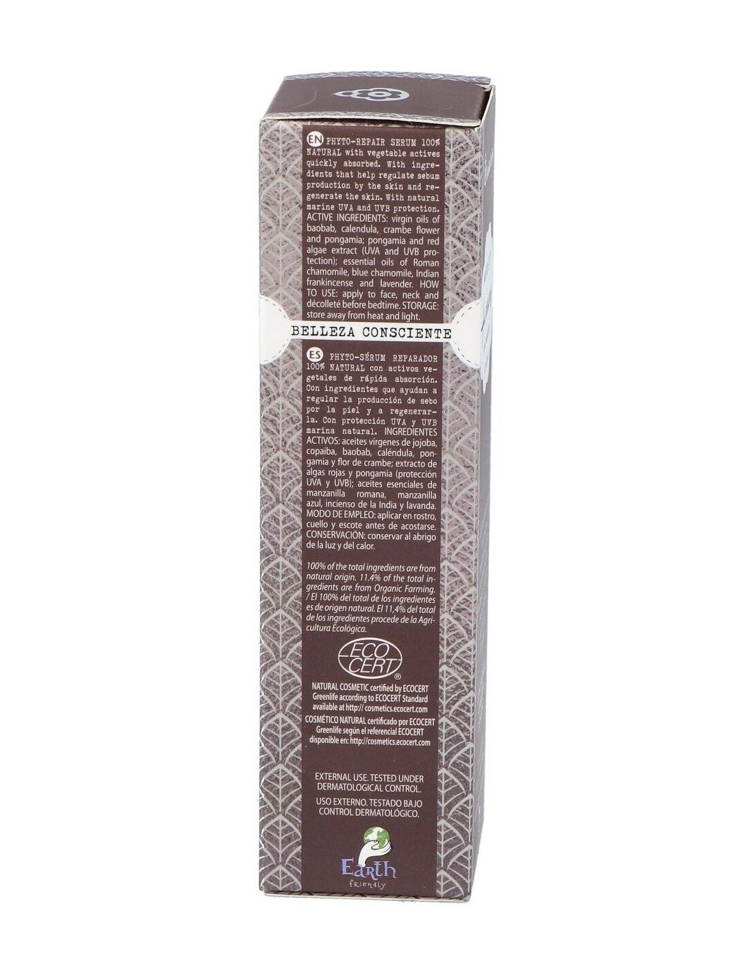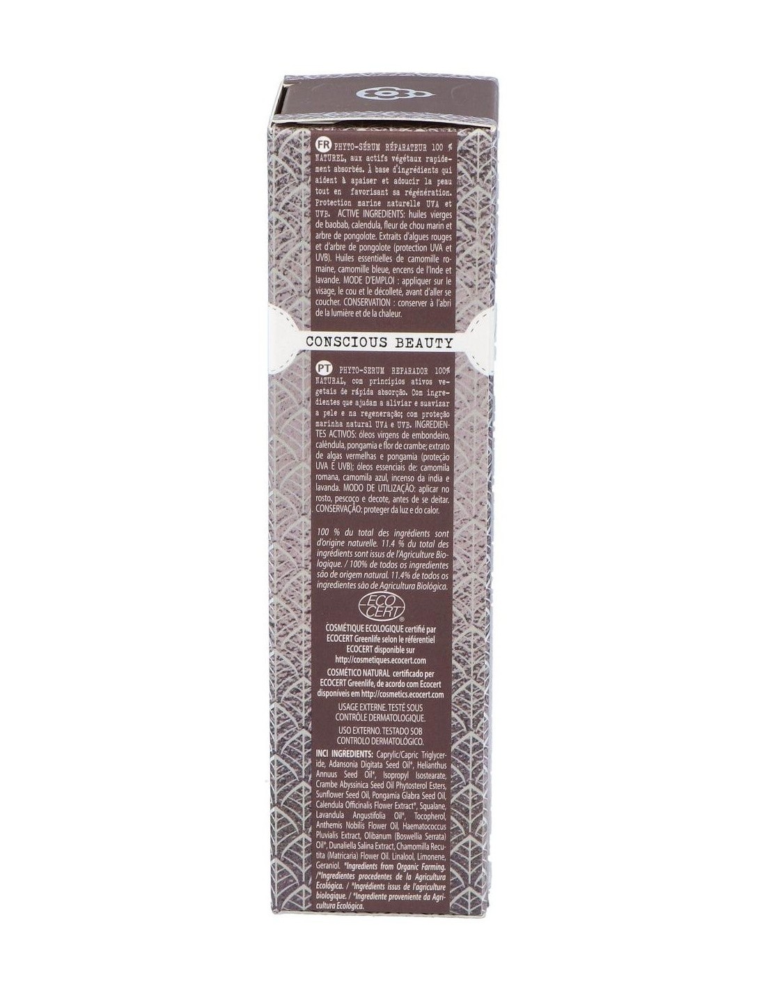 Aceites vírgenes de jojoba, baobab, caléndula, pongamia y flor de crambe; extracto de algas rojas y pongamia (protección UVA Y UVB); aceites esenciales de: manzanilla romana, manzanilla azul, incienso de la India y lavanda.
