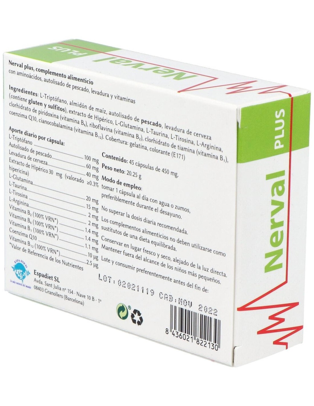 ESPADIETNerval Plus 45Cap. de Espadiet es un complemento alimenticio para personas que buscan apoyar el bienestar nervioso, formulado con ingredientes naturales que contribuyen a la relajación y el equilibrio emocional.