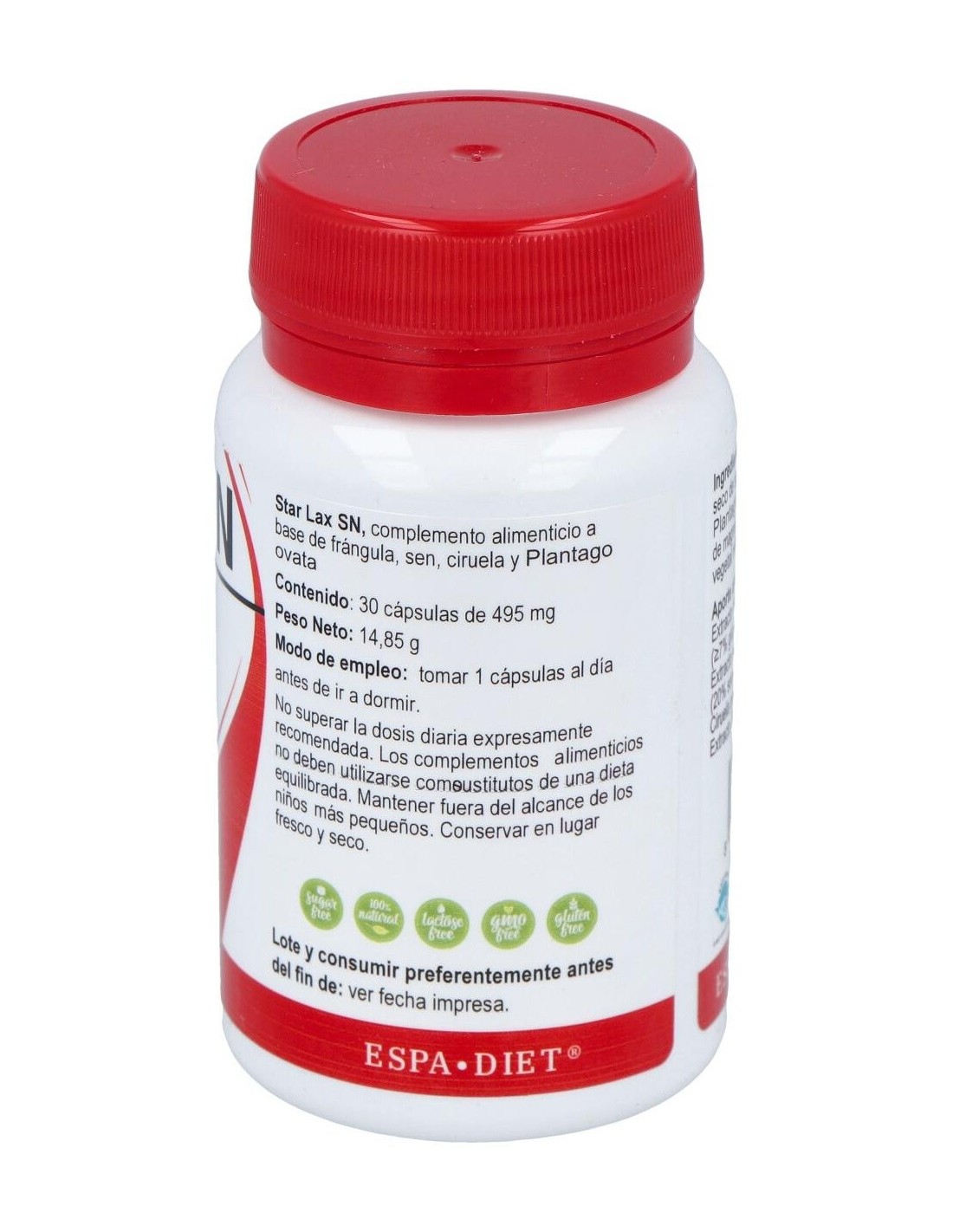 Extracto concentrado de frángula, extracto concentrado de sen, ciruela fruto, extracto concentrado de Plantago ovata y antiaglomerante (estearato de magnesio). Cobertura: cápsula celulosa vegetal HPMC.
