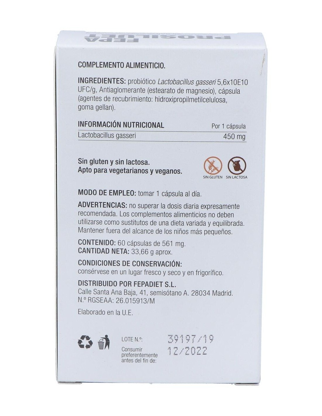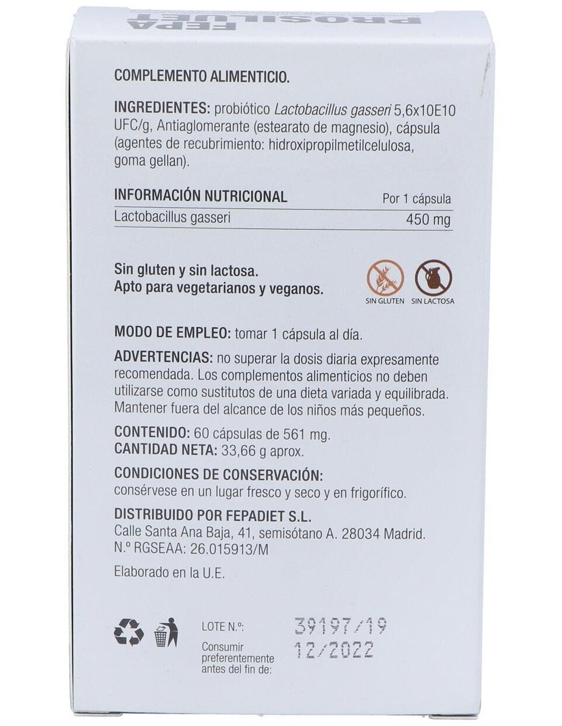 FEPADIETComplemento alimenticio en forma de cápsulas, elaborado a base de una cepa probiótica de lactobacillus gasseri, que ayuda a regular la flora intestinal, protegiendo así el sistema digestivo ante posibles infecciones. Favorece una mejor digestión, y ayuda a reforzar el sistema inmunitario.